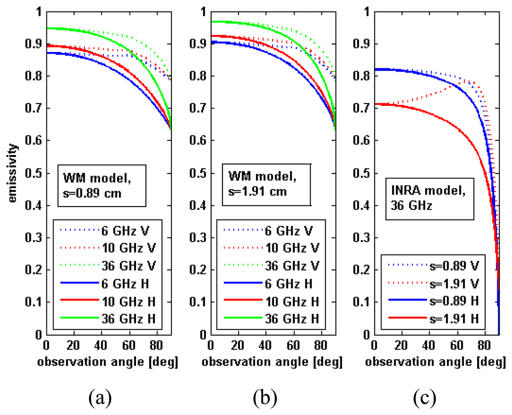 Figure 1 shows the trend of the emissivity versus the observation angle, as predicted by the two models. It can be noted that the emissivity foreseen by the INRA model for the 36 GHz band is smaller than the emissivity predicted by the WM model (at the same frequency). The former presents a higher sensitivity to the observation angle, with a sharper decrease in correspondence to higher angles. Furthermore, for s=0.89 cm, the appearance of the Brewster effect can be observed for the INRA model. We point out that the consideration of two emissivity models, presenting different sensitivities to the observation angle, aims at assessing the generality of the results. A comparison of these models or their validation is beyond the scope of this study.