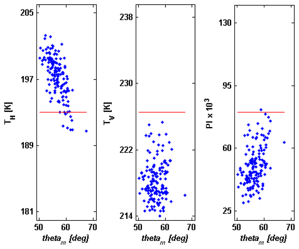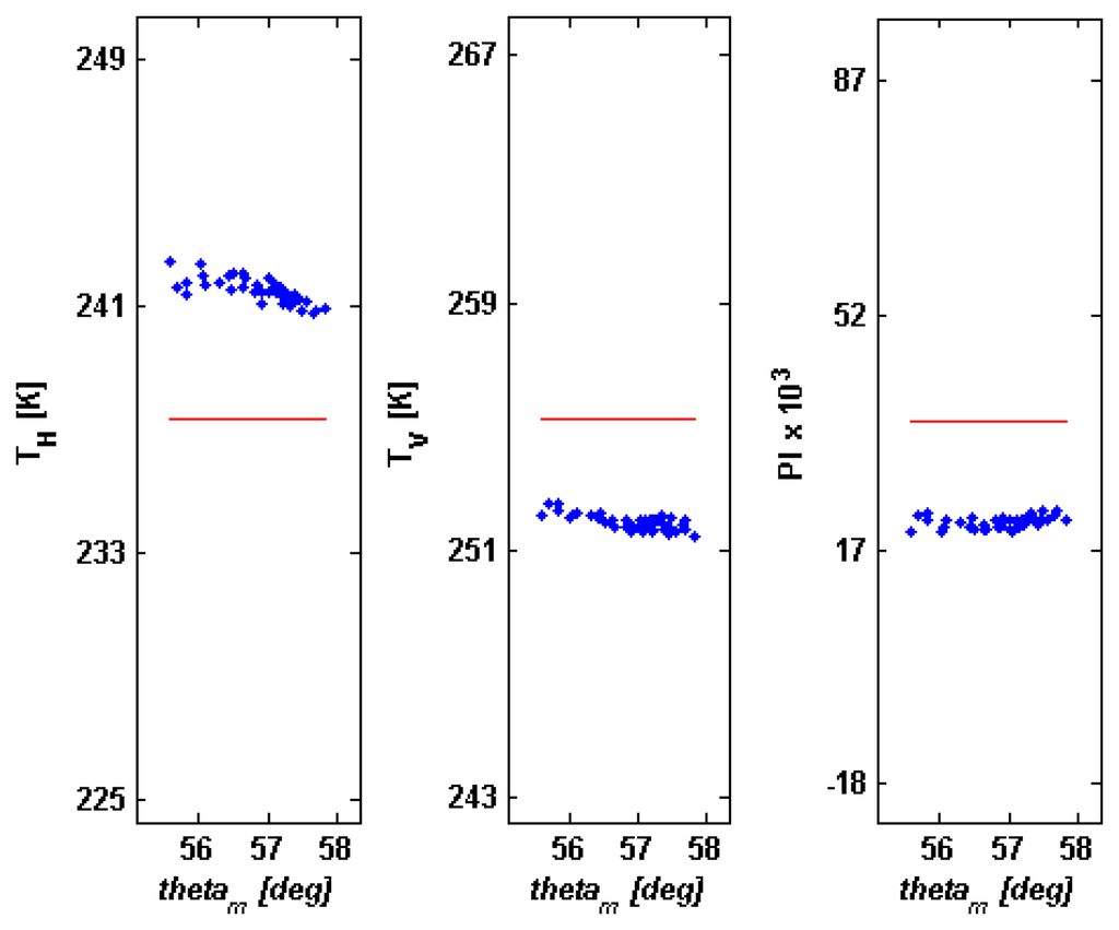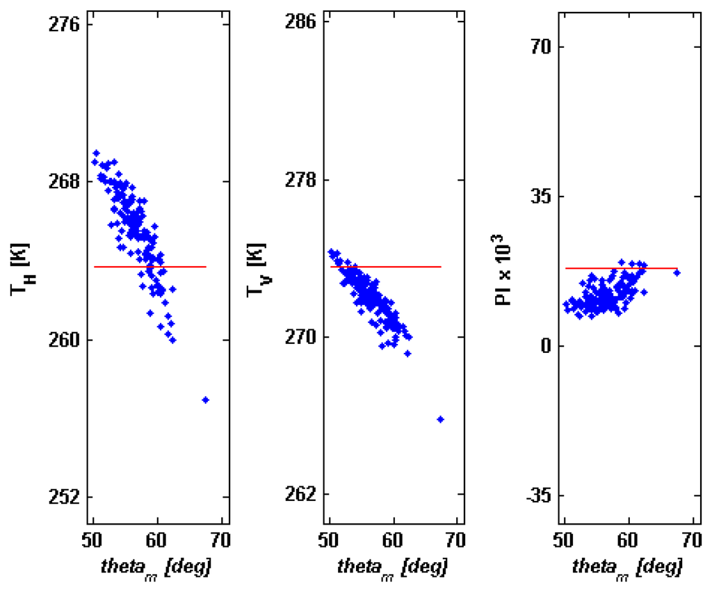 Table 4 quantifies the result shown in Figure 6. The maximum decrease of TV is equal to −7.70 K and the maximum rise of TH is 5.83 K. It is worth mentioning that, neglecting depolarization and weighting, the mean values of ΔTH and ΔTV at Ka band would be in the order of −7 K and −5 K and that the decrease of TH would reach −16.5 K. Again, beam weighting and rotation of the polarization plane cause an effect that contrasts this lowering of TH. However, for largest θm's the effect of the local angle prevails and TH < THflat.