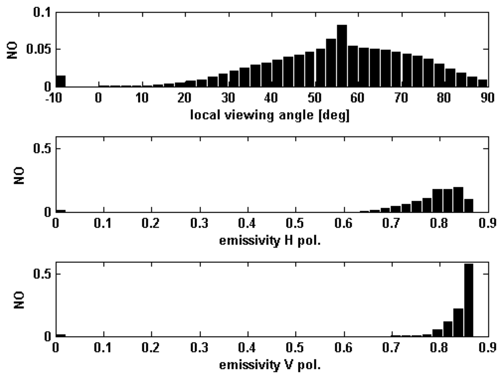 The histograms of the emissivity at 6.925 GHz for a bare soil with s=0.89 cm, computed by applying the WM model and Equation (3), are shown in the central and bottom panels of Figure 3 for H and V polarizations, respectively. It can be noted that the histogram for V polarization is narrower than the histogram for H polarization. This is due to the less sensitivity to the observation angle presented by the former (Figure 1, left panel).