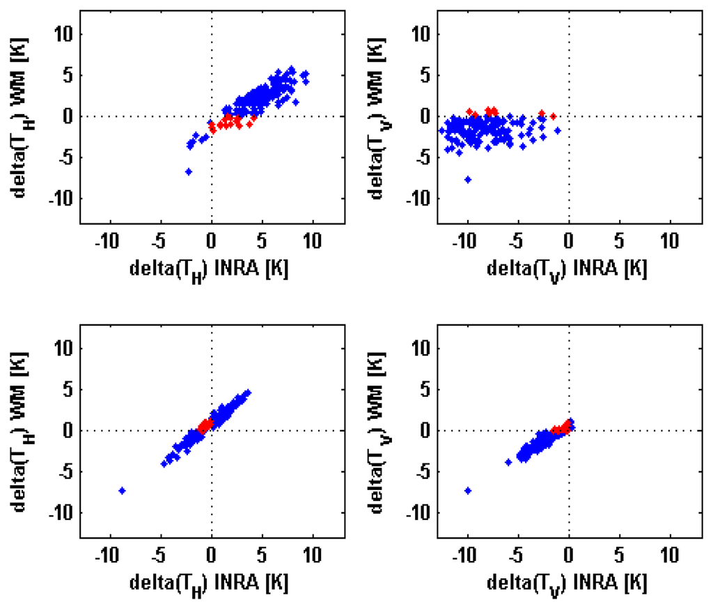 Figure 8 compares for Ka band, the values of ΔTH achieved by using the INRA model with those obtained with the WM model. The purpose is to show that situations which may be critical for our results, in which the relief causes an overestimation of TH using one model and an underprediction adopting the other, occur for only few cases (red points in Figure 8). It is worth noting that although for s=0.89 cm the correlation between ΔTV's is small, the percentage of red points is 5% only. The maximum value of this percentage is 12% (s=0.89 cm, H polarization). We can therefore conclude this discussion on Ka band affirming that, despite the different sensitivities to the observation angle predicted by WM and INRA models, the results that we have achieved can be considered fairly general. What changes is only the magnitude of under- or overestimation, which is model dependent, as expected.
