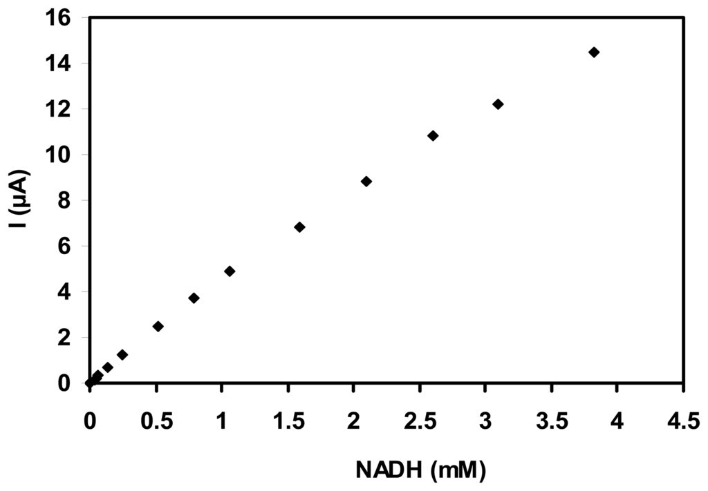 After each addition of NADH, the anodic current increased and reached a steady state within 4 s. The sensitivity is about 4.6 mA/M (with a SD of ±0.25, for n=3), a linear response range is observed up to 3 mM NADH and a detection limit of 0.5 μM (based on signal/noise = 3) was calculated.