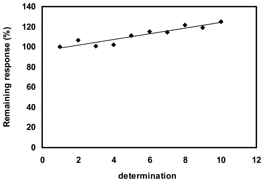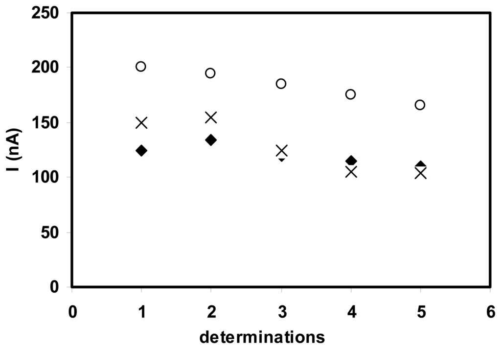 The stability of the MDH/SWNT-GC electrode was studied by repetitive amperometric measurements of a solution of L-malic acid 0.1 mM. Although the response of biosensor decreased from an assay to another due to the leakage of a part of enzyme, the electrode could still retain about 75% of the initial response after 5 determinations for all three cases of enzyme loading (Fig. 4).
