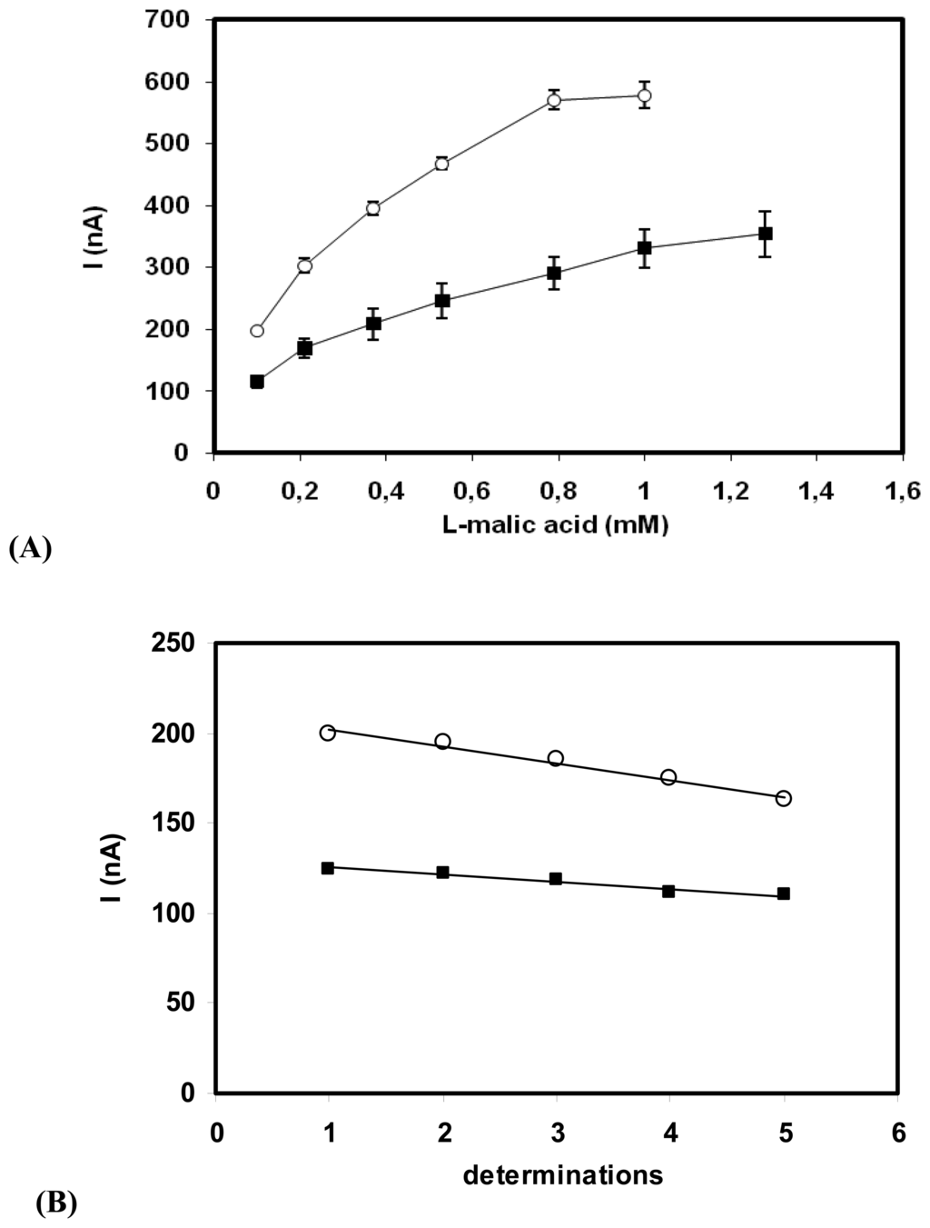 (A) Calibration curves of MDH biosensors: (■) MDH-Nafion/SWNT-GC and (○) MDH/SWNT-GC electrodes. (0.7UI MDH/electrode; 2 mM NAD+; E= 300 mV vs. Ag/AgCl) (B) Operational stability of the MDH biosensors. (■) MDH-Nafion/SWNT-GC electrode and (○); MDH/SWNT-GC electrode. (0.1 mM L-malic acid, 2 mM NAD+; E= 300 mV vs. Ag/AgCl)