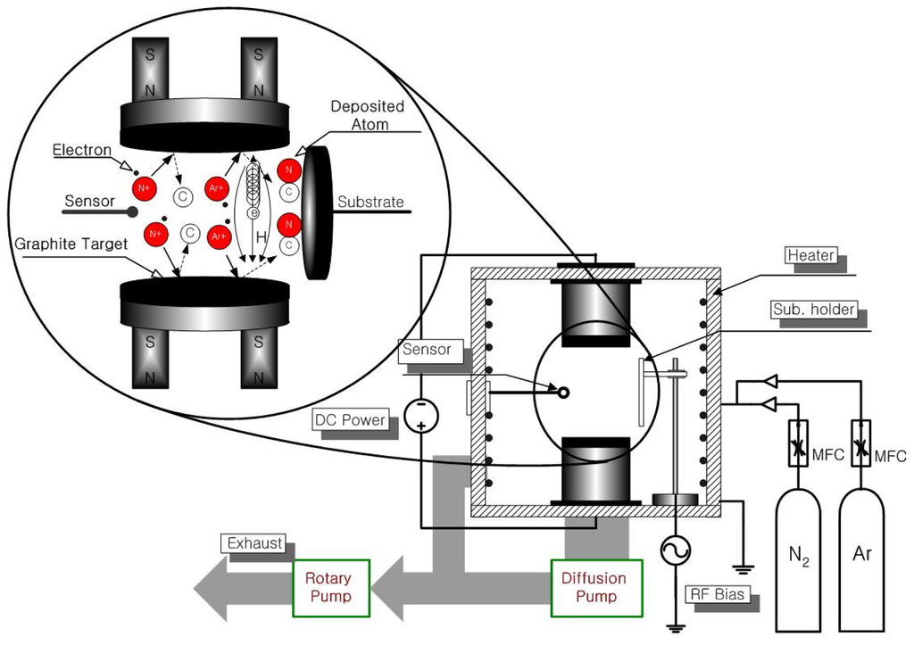 The carbon nitride film was formed by the reaction of nitrogen gas (99.999 %) with a 3 inch carbon target (99.99 %) in the facing target sputtering chamber. The ratio of nitrogen to argon, controlled by mass flow controller (MFC), was 7:3, which was reported in a previous work to be the condition allowing for the highest amount of nitrogen to be incorporated [3]. To reduce the influence of contamination from the chamber wall and undesirable gases, the whole chamber wall was heated, and a thermocouple was attached to the back of the substrate holder, in order to maintain the substrate temperature precisely at 150 °C. Fig. 1 shows a schematic of the reactive RF magnetron sputtering system with dc bias. SEM (ABT-32, TOPCON) was used to observe the surface morphology of the films. The FTIR spectra were obtained by Research I series Mattson with 4 cm-1 resolution. Film thickness was determined by Alpha-Step 500 (KLA-Tencor), and TGA/DTA study was made with SDT2960 (TA instruments).