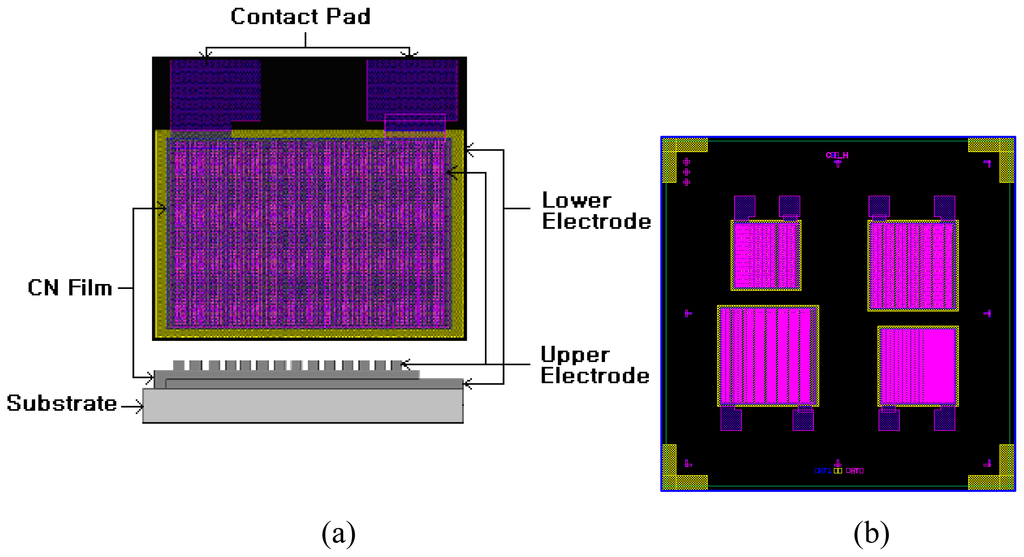 A capacitive type humidity sensor with meshed top electrode; (a) schematic view and (b) mask layout.