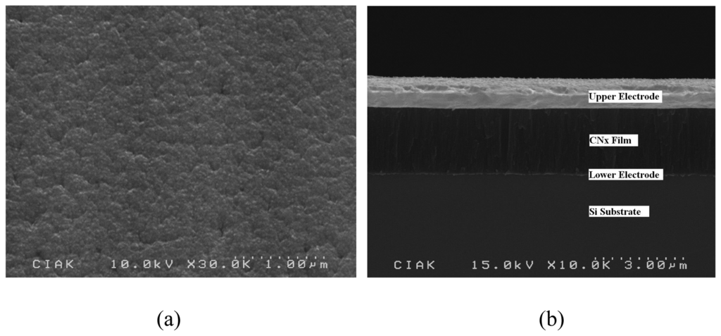 Fig. 3 shows the SEM images of the Al/CNx/Al/Si structure, in which the carbon nitride film was formed with an RF power of 200 W for 1hr. The growth rate of the film is about 1.5 μm/hr. The film is composed of nano-structured grains (ca. 20 ∼ 40 nm), which have a dense morphology, as shown in Fig. 3(a). The lower electrode is thinner than the upper electrode in Fig. 3(b), because Ar sputtering was performed in order to remove the contaminant on the lower electrode surface before the deposition of the CNx film. Furthermore, Al from the lower electrode diffused into the Si substrate forming aluminum silicide.