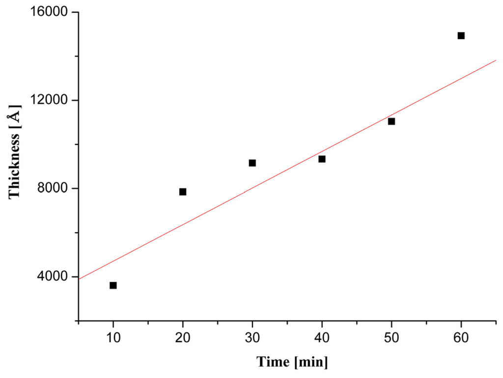 A uniform growth rate is one of the most important factors in the carbon nitride deposition process. The film thickness determines the sensor performance in the case of both resistive and capacitive type sensors. Yu et al. [15] first produced non continuous crystalline β-C3N4 films by the diode sputtering technique. The substrates were in contact with the plasma and were therefore subjected to bombardment by the plasma electrons and ions as well as by the energetic primary electrons. They said that this electron bombardment effects not only causes a higher substrate temperature, but also has an effect on the film growth. Films prepared by this method were completely amorphous and had a nonlinear growth rate. Thus, it is necessary to have a sputtering system in which electrons can be completely trapped, in order to rule out the effect of electron bombardment. These trapped electrons cause a higher degree of ionization and this can be one of the key factors allowing for the deposition of crystalline carbon nitride. Fig. 4 illustrates the relationship between the thickness of the CNx film and the deposition time. The film thickness is proportional to the deposition time, because DC bias of the substrate provides control over the electrons, and the heating of the whole chamber reduces the effect of the higher substrate temperature due to electron bombardment. From the fitting line, the growth rate is about 1.5 μm/hr.