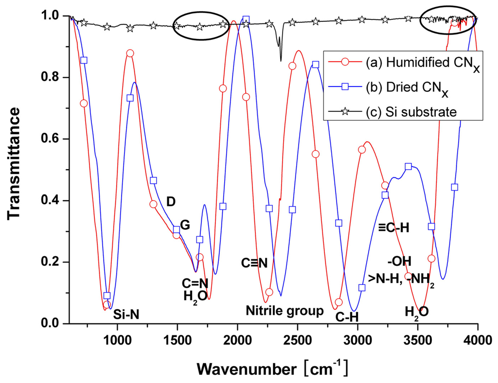 To determine the influence of the adsorption of water vapor, two samples were prepared for FTIR analysis, viz. the humidified CNx film kept in the chamber at over 90 %RH for 24 hr and the dried sample kept in the dehydrated chamber purged with N2 for 24 hr. The spectra of the humidified CNx film (Fig. 5(a)) and the dried CNx film (Fig. 5(b)) both have Si-N (940 cm-1), D (1270-1410 cm-1), G (1520-1590 cm-1), C=N (1600-1700 cm-1), C≡N (2200 cm-1), nitrile group (2367 cm-1) and C-H (2970 cm-1) peaks. However, some peaks, such as ≡C-H (3300 cm-1), -OH (3400 cm-1), >N-H and -NH2 (3200 - 3380 cm-1) and H2O (3500 cm-1), are dominant in the humidified CNx films, and are remarkably reduced in the dried CNx films. This demonstrates that the CNx film reacts easily with hydrogen and/or hydroxyl groups. The peak shift due to the adsorption of water vapor is clearly observed. The spectrum of the Si substrate (Fig. 5(c)) is included as a reference.