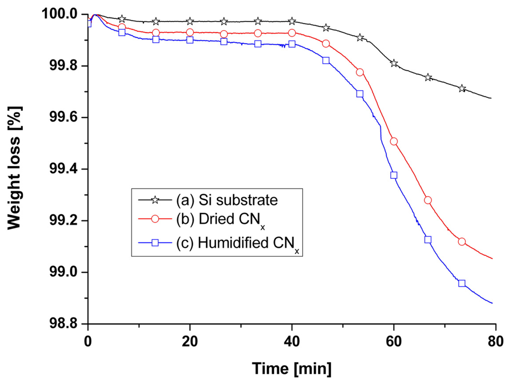 Weight loss curves of Si substrate (a), dried CNx film (b) and humidified CNx film (c).