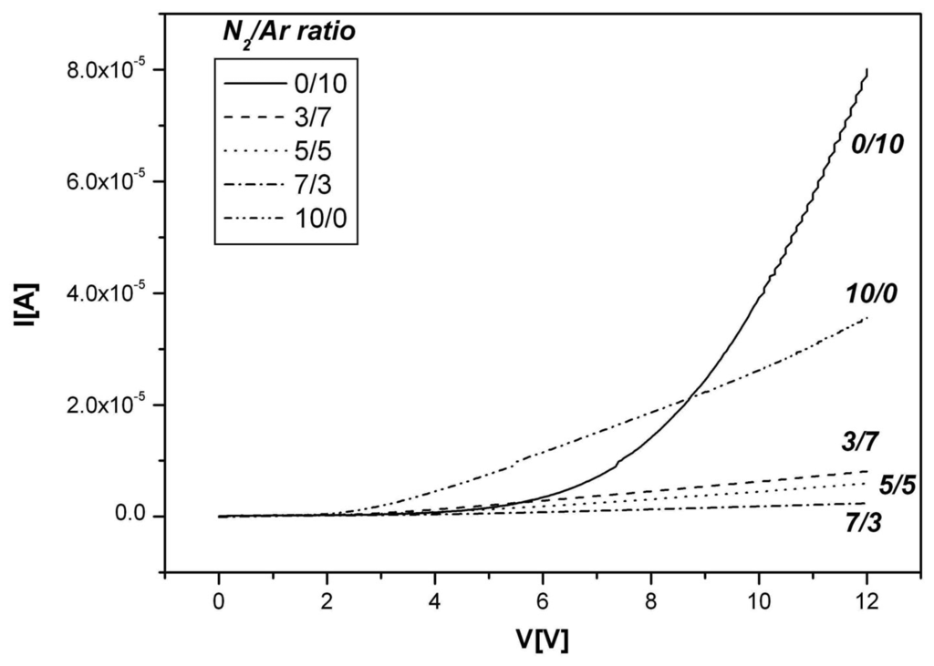 Current-voltage characteristics of carbon nitride films as a function of N2/Ar ratio.