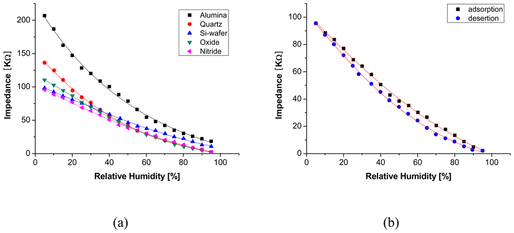 Impedance changes to relative humidity of carbon nitride films at 25 °C; (a) with different substrates, and (b) hysteresis in the silicon nitride substrate.