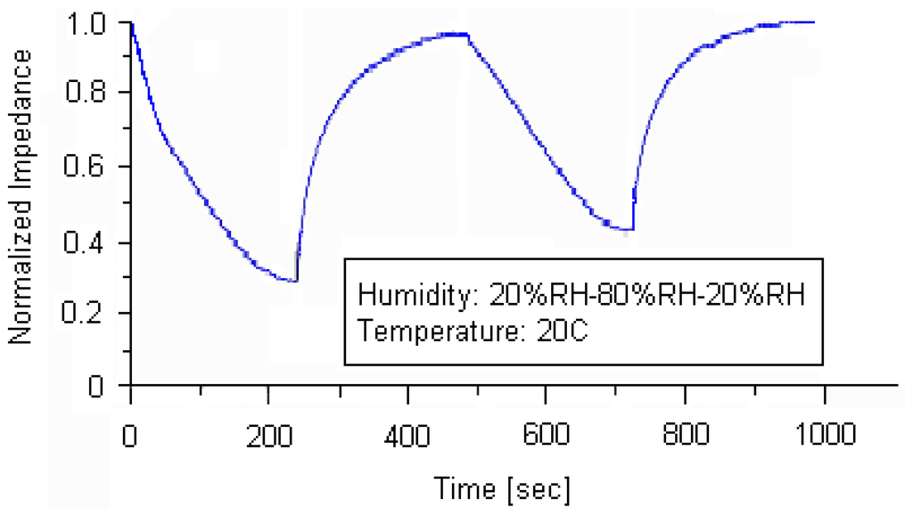 To get the time response and the reversibility characteristics of the sensors, two different humidity columns of 80 %RH and 20 % RH are prepared in a measuring chamber. A sensor is moved automatically from one column to the other column by PID controller. Fig. 9 shows the response curve of the carbon nitride sensor with silicon substrate, in which the impedance is normalized. The response time is defined as the interval time between 10 % and 90 % of its full range. Adsorption and desorption time according to the column transit change are about 150 sec and 175 sec, respectively. Like most other chemical sensors, desorption time is longer than adsorption time.