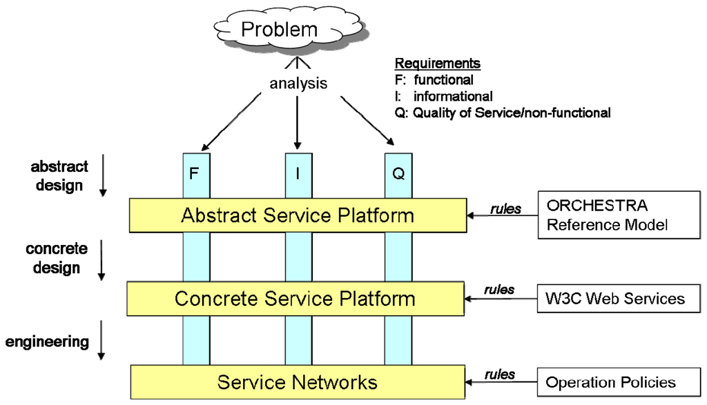 The ORCHESTRA process model applies an incremental, iterative approach for the analysis and design phases. Usually, a multi-step breakdown process across several abstraction layers is necessary to analyze user requirements and map them to the capabilities of a service platform. ORCHESTRA distinguishes between an abstract service platform that is specified independently of a given middleware technology and a concrete service platform (see