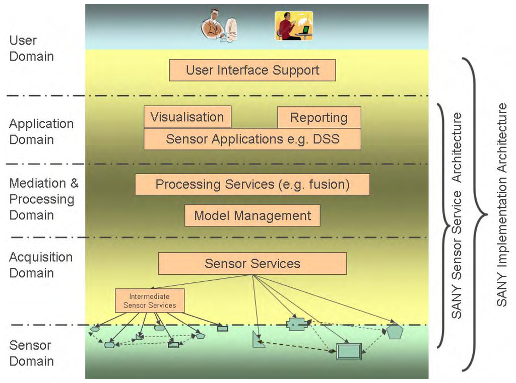 Figure 1 shows some of the inheritance of the SANY project. Secondly, the SANY sensor service architecture (described in the next section) is being developed. Through the concepts of data fusion and decision support the outputs of this architecture and services are studied within the project. Finally, the project's results are validated in three independent domains: air pollution, marine risks and geological hazards (geohazards), which also provide valuable information on user requirements for sensor networks.