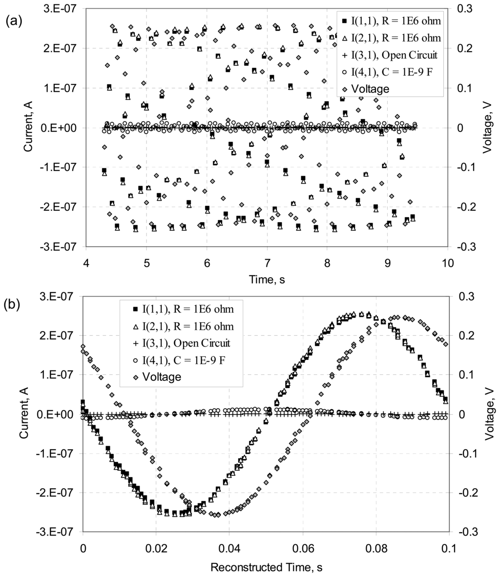 Figure 3(a) shows the original time series. As expected, for any given channel of current (I(x,y)) or the voltage data (Voltage;, there are ca. 22 data points for every second of data acquisition. The frequency dependence of the current, if any, is not revealed in the raw time-based data, however. The raw time-based data appears as pure noise. Figure 3(b) shows a reconstructed, single sine wave generated from the raw time-based data shown in part (a). The time base is reconstructed by subtracting a multiple of the known period of the waveform. The reconstructed time for each data point is the time since the start of the most recent waveform. The imposed 10 Hz sine wave is evident in the reconstructed data.