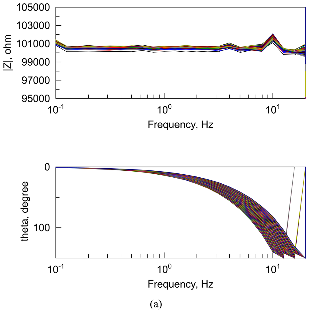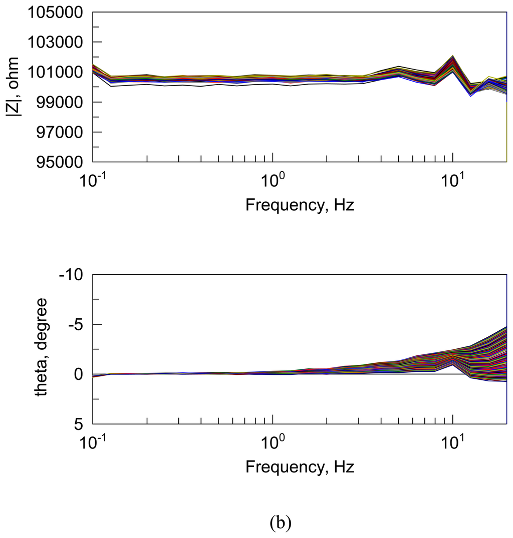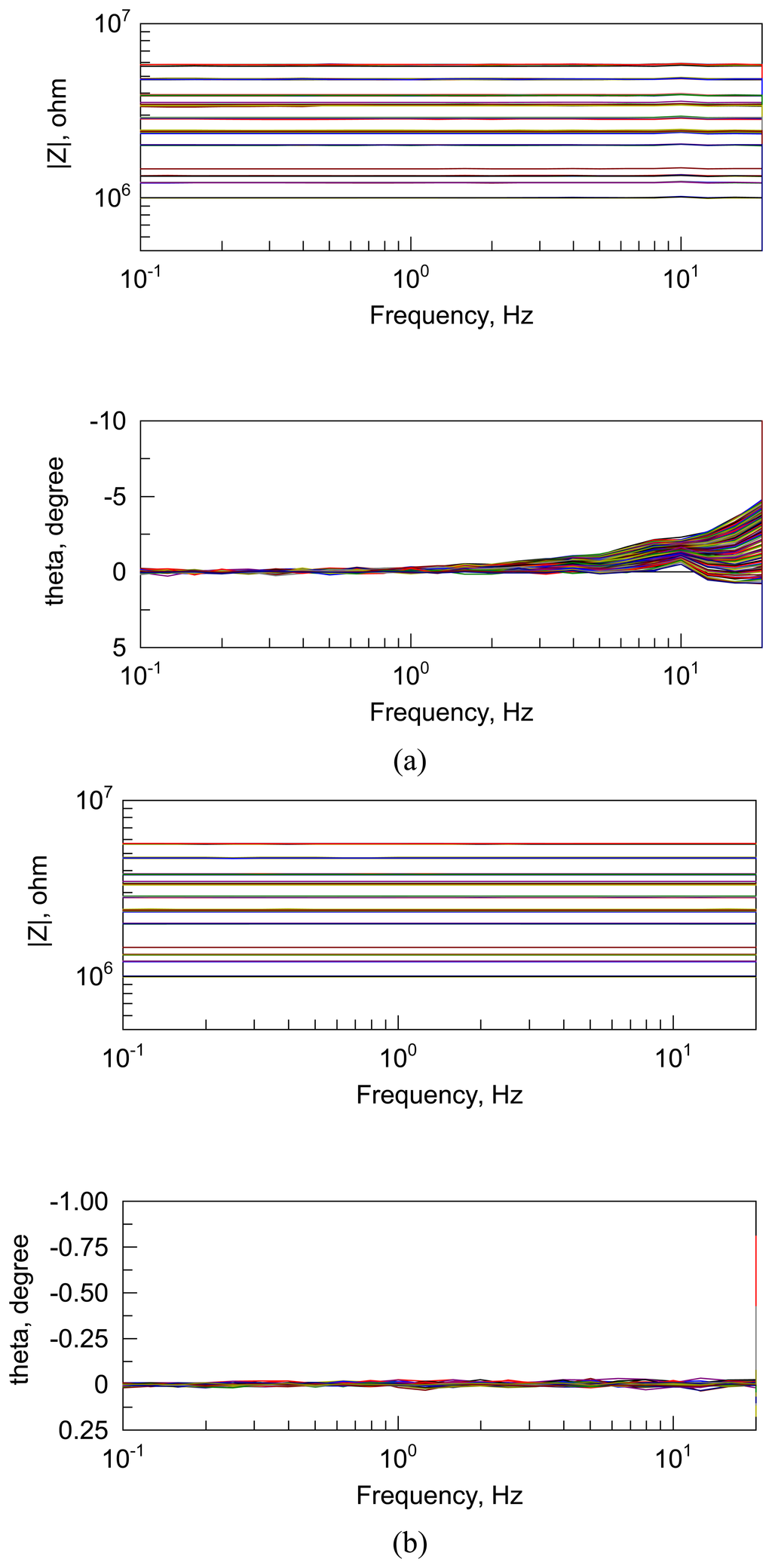 Low frequency impedance of an array of one hundred resistors ranging from 1 MΩ to 50 MΩ. (a) Complex impedance obtained from parallel FFT method in 7 minutes. With time skew correction factors applied the phase error is less than 2.5° at 10 Hz indicating that the parallel measurement method can be used to simultaneously obtain the impedance of large array. (b) Complex impedance determined using standard sequential measurement approach in 120 minutes.