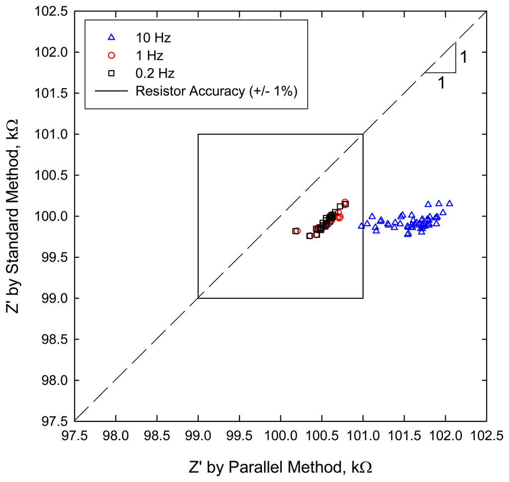 We can quantify the accuracy of the parallel method by comparing its results to that obtained with the standard method. Table 3 summarizes statistical properties of the real component of the impedance Z′ for the parallel and standard measurement methods when measuring an array composed of ninety-eight (98) 100 kΩ resistors (±1 % rated accuracy). In addition, Figure 5 shows the real impedance Z′ determined via the two methods where the box indicates the region of expected values based on the rated accuracy of the resistors.