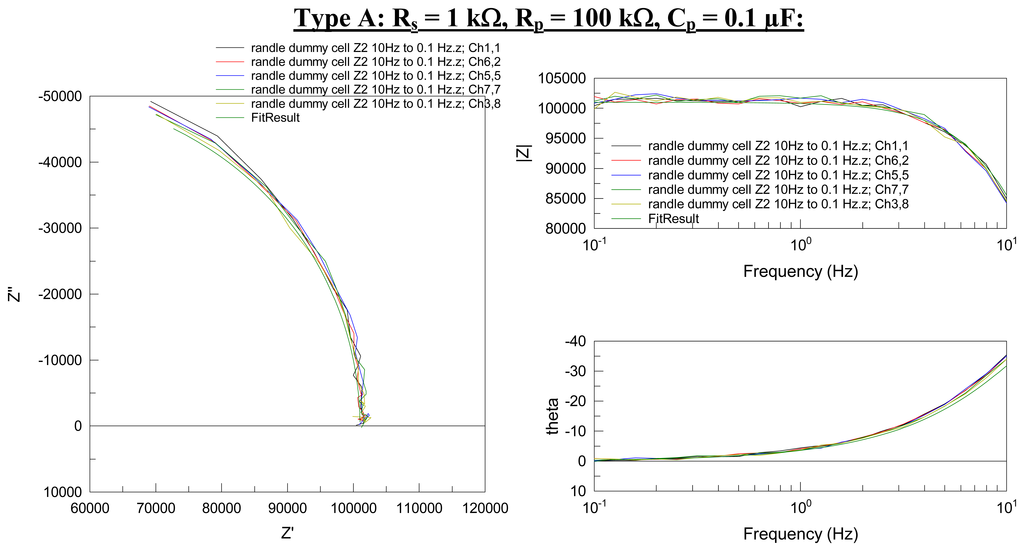 Figure 7 summarizes the low frequency impedance of the four types of equivalent circuits determined via the parallel measurement method. Within a given type of equivalent circuit the results are very reproducible. Furthermore, despite the noise observed in some of the data sets, the absolute values are correct, as evidenced by the predicted impedance spectra labeled “FitResult” in each graph. The exception are the results for the Type D dummy cell in which the measured low frequency impedance consistently exceeded the predicted value by approximately 1.1 %. The source of the discrepancy is under investigation.