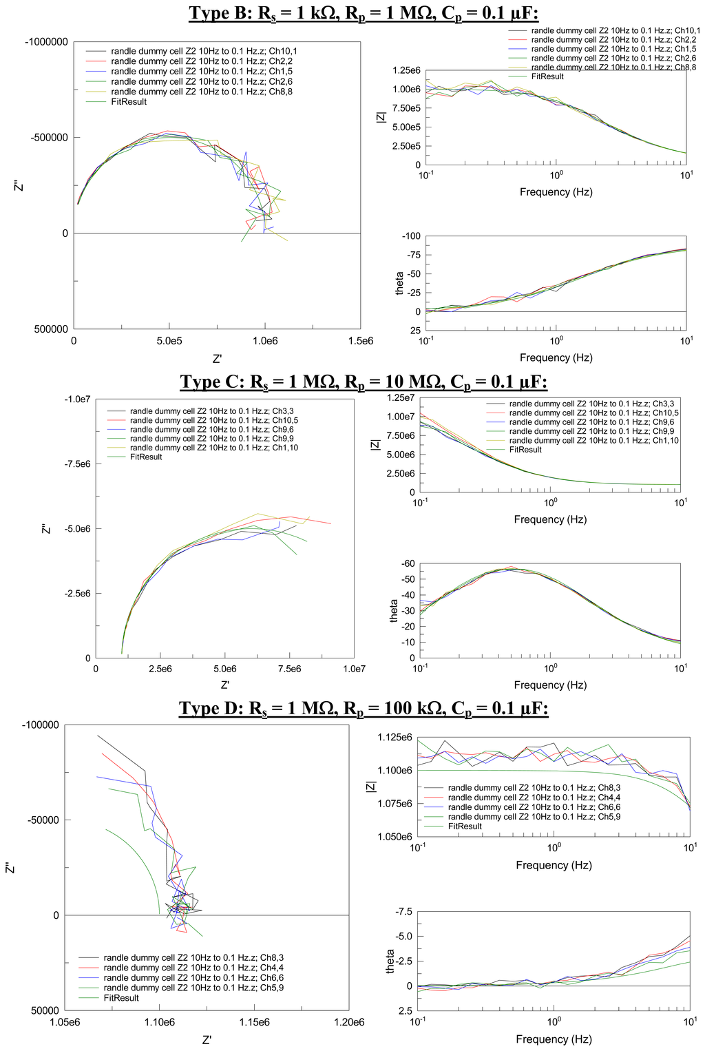 There was, however, a > 10 % error in the fitted value of the 1 kΩ series resistor (Rs) used in the Type A and B dummy cells, which was observed in other experiments as well, and only occurs when measuring a dummy cell containing a parallel resistor-capacitor (Rp‖Cp) element. That is, this error is not evident when measuring a resistor alone. Neither was this error observed when Rs ≫ 1 kΩ, e.g., type C and D dummy cells. The source of this error is uncertain.