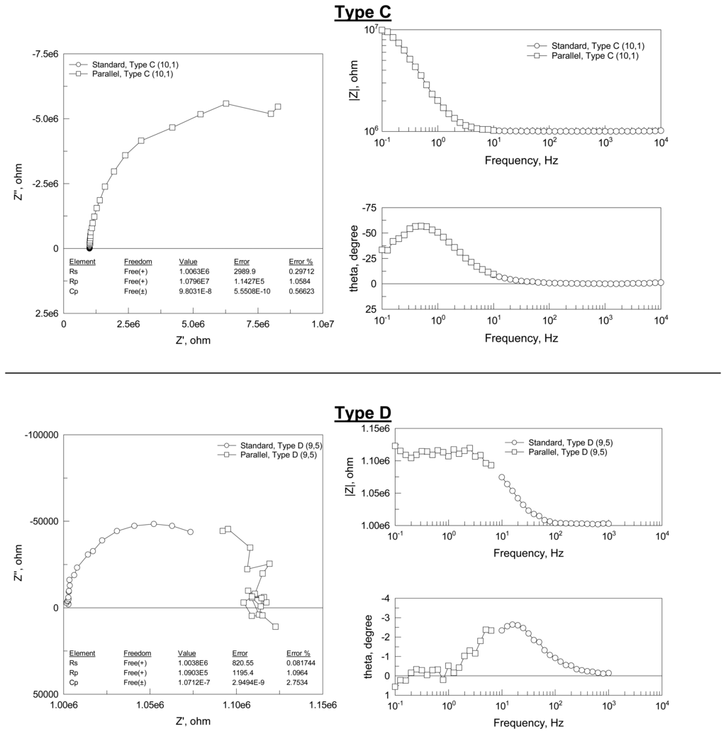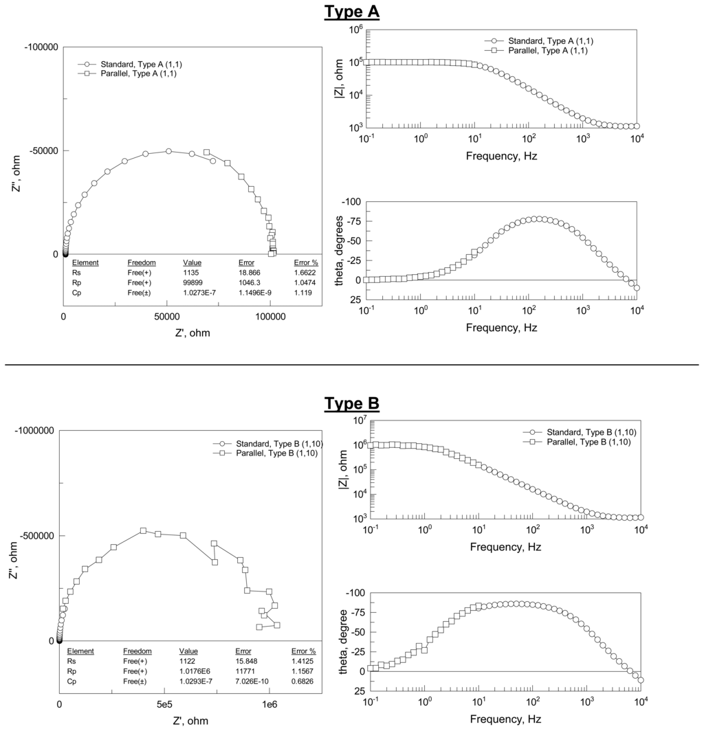 Noise in the data is evident, in particular at low frequencies and for the cells with very high impedance (e.g., Type B and D) where |Z| ≥ 1 MΩ. The source of noise is due to the magnitude of the AC voltage perturbation (50 mV) and the accuracy of current measuring ZRA circuitry. The ZRAs used here were 100 μA full-scale with a resolution of 3.3 nA. At 50 mV AC and Z ∼ 1 MΩ, the current was no more than ∼ 50 nA and generally much less than this value. Higher impedance results in even lower current signal. Such small currents approach the bit-resolution of the instrument and thus increase the noise in the data. The remedy to this problem is to match the current measurement circuitry and/or the magnitude of the AC voltage perturbation to the impedance to be measured. It should be noted that using a larger AC perturbation than used here would significantly reduce the noise (but may not be practical for real systems that exhibit non-linear response).
