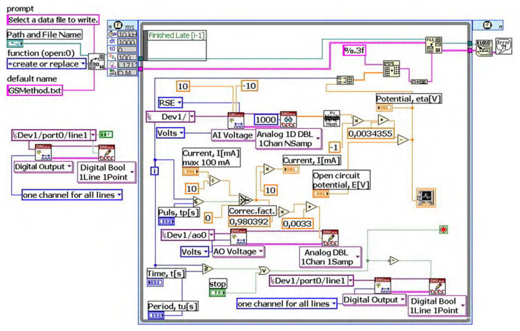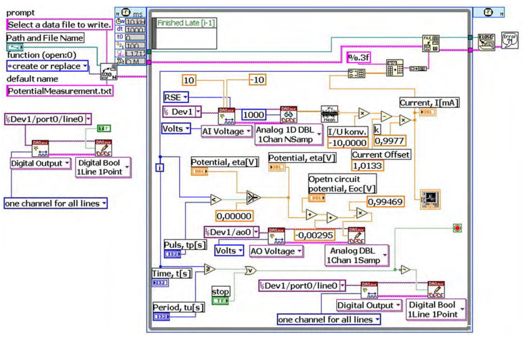 As an example, the Block Diagrams as well as Front Panels has been showed for the characteristic electrochemical methods.
