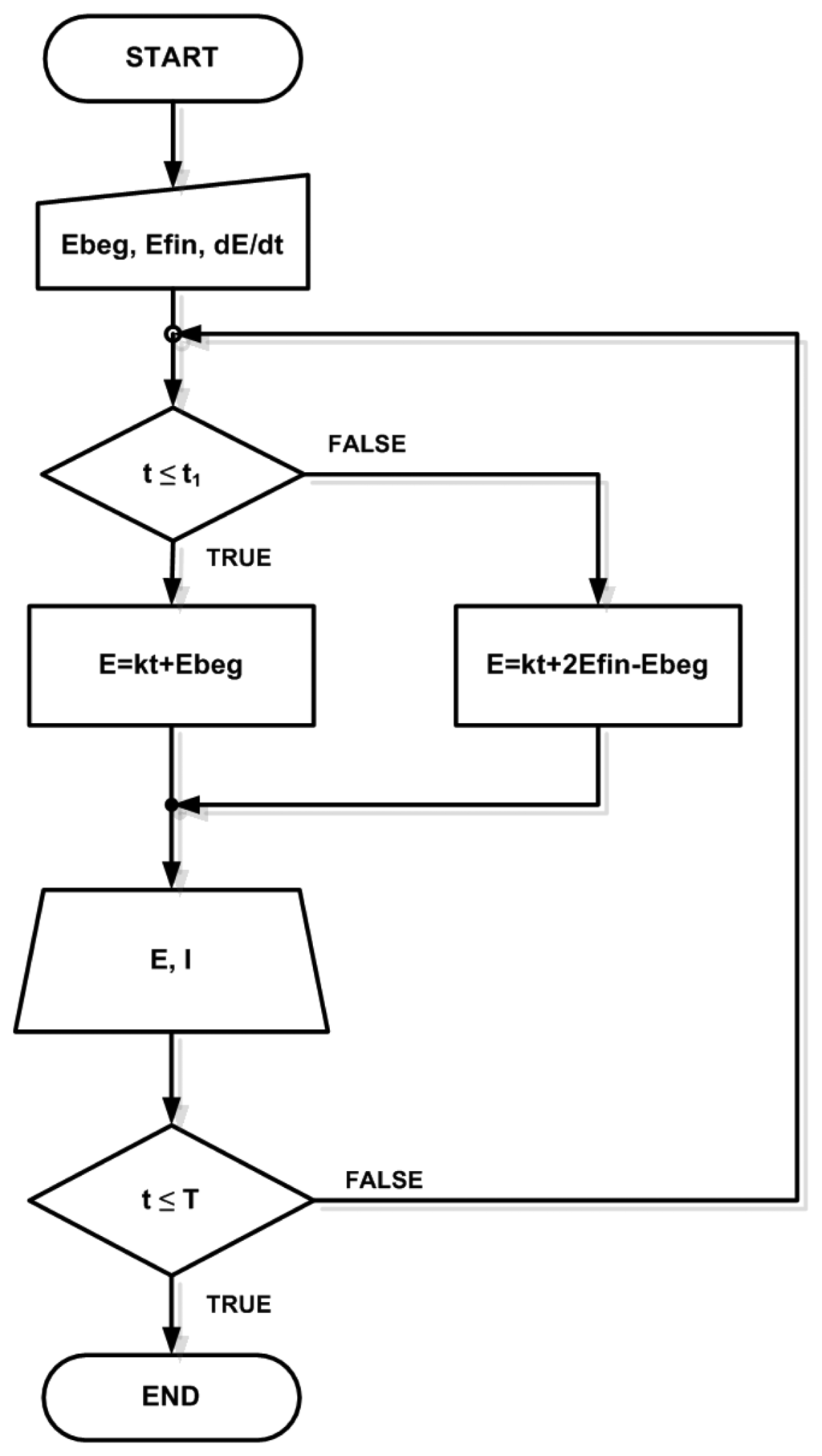 where: E – is current value of the voltage; t – is time, k = dE /dt - the assigned sweep rate; t1 = (Efin − Ebeg ) / k - is the time duration of the voltage rate, Ebeg – is the beginning of the voltage; Efin – is the final value of the voltage.