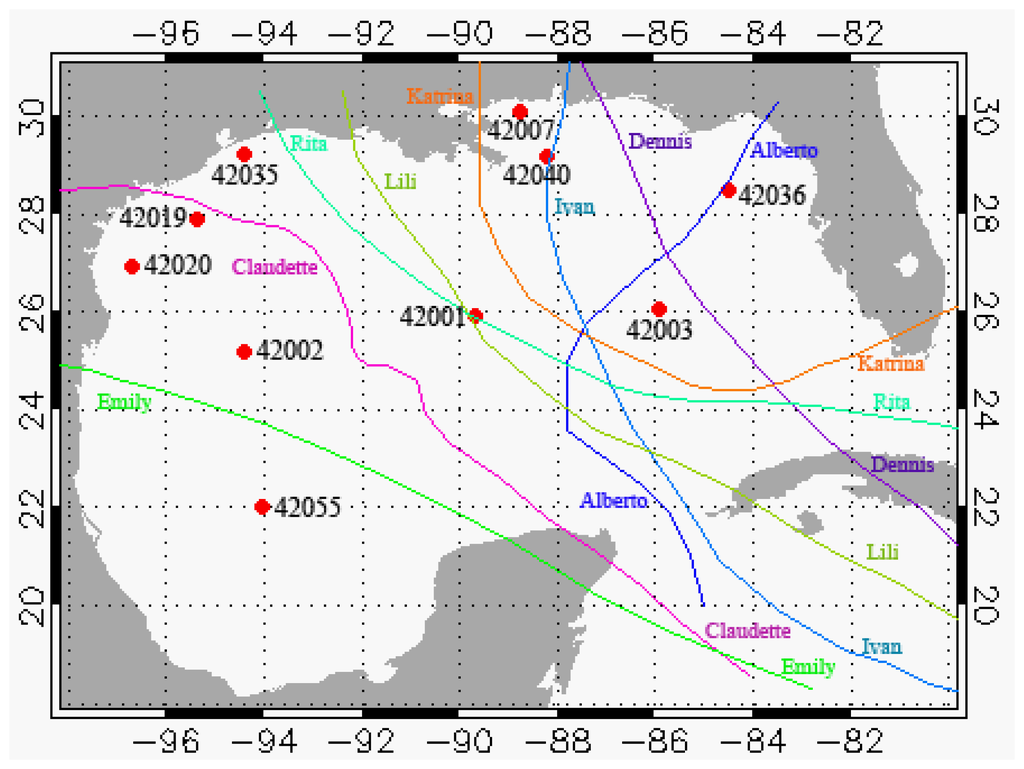 - Stone, G.W.; Walker, N.D.; Hsu, S.A.; Babin, A.; Liu, B.; Keim, B.D.; Teague, W.; Mitchell, D.; Leben, R. Hurricane Ivan's Impact Along The Northern Gulf of Mexico. EOS 2005, 86(48), 497–508. [Google Scholar]
