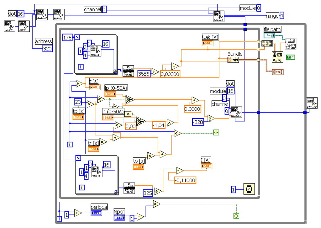 The application overall diagram is shown in Figure 6. Except the shown measuring and control loop, the following program blocks in the initialization section [8, 9]: InitSW - software initialization, 428W - the board initialization, AssignIO - the Input/Output definition, HWInit - hardware function preparing, Slot - slot address defining, Address - address within slots choice, AOConf - output channel configuration, Channel - number of channels, Module - module number and Range - voltage range are used.