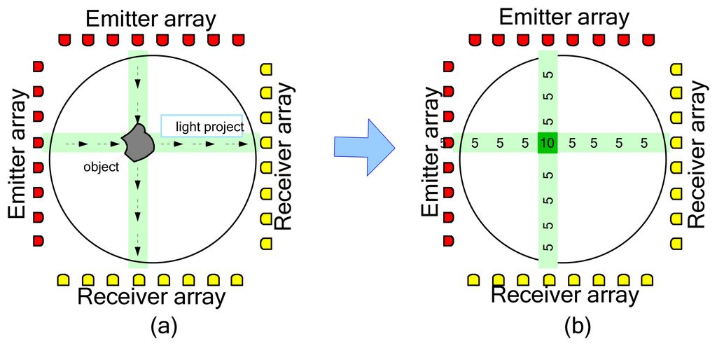 - Pang, J.F.; Rahim, R.A.; Chan, K.S. Infrared sensor configuration using four parallel beam projections. Proceeding 3rdInternational Symposium on Process Tomography in Poland 2004, 48–51. [Google Scholar]