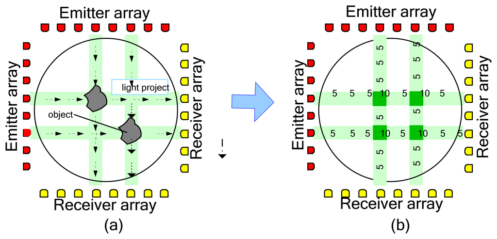 Pang [] implemented four projections arrays (2 orthogonal and 2 rectilinear) in optical tomography system. The extra two layers (the Rectilinear layers) were used to filter the ambiguous image and smearing effects. However, analogue acquisition was used to acquire all the measurements. The obtained data from masking layer were used for comparison to predetermined threshold values. Using this method, valuable time was utilized for analogue to digital conversions. Furthermore, the number of sensors on the rectilinear was quite large. Although the research successfully implemented real time optical tomography system, it required four powerful personal computers and a network hub in order to implement data distribution system. The resulting system was bulky and not portable.