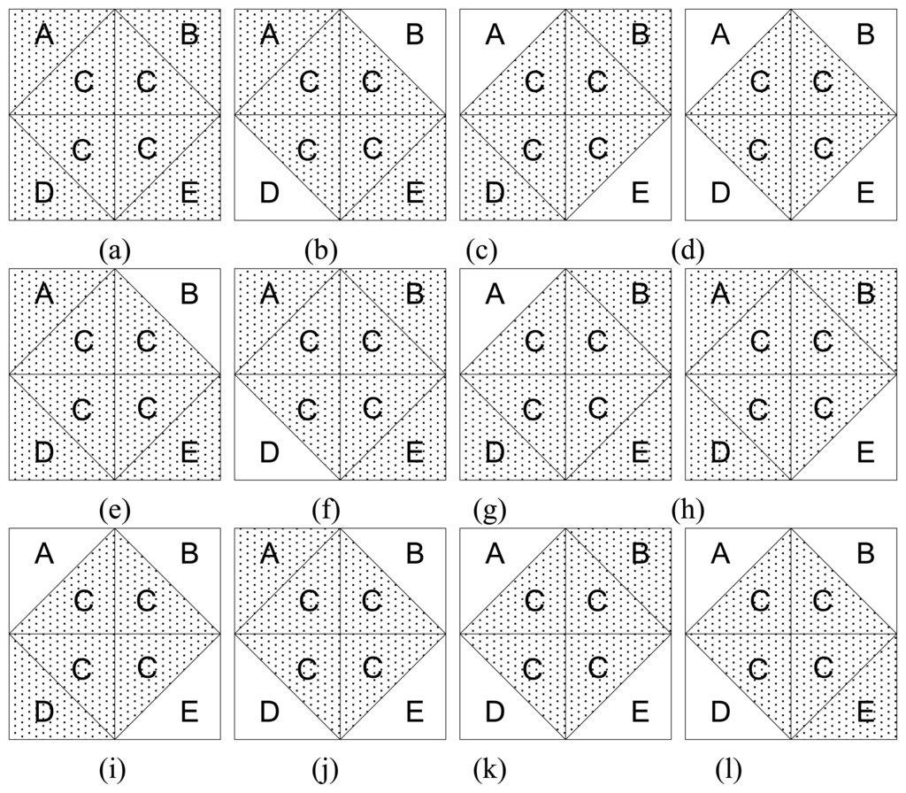 Using this approach, detection of arc edges of flow object can be presented more accurately. As a fair comparison, let's consider a pixel which is located at the centre of the flow region. The total area in this pixel is 28.3 mm2 for the 85mm diameter pipe being used in this research. Therefore, each triangle contributes one-eight (⅛) of the total pixel, which is 3.5375 mm2. Using this new Hybrid Reconstruction algorithm, there could be twelve possible cases to represent each pixel instead of only one case. These are shown in Figure 13, where triangle parts are shaded to represent blocked location.