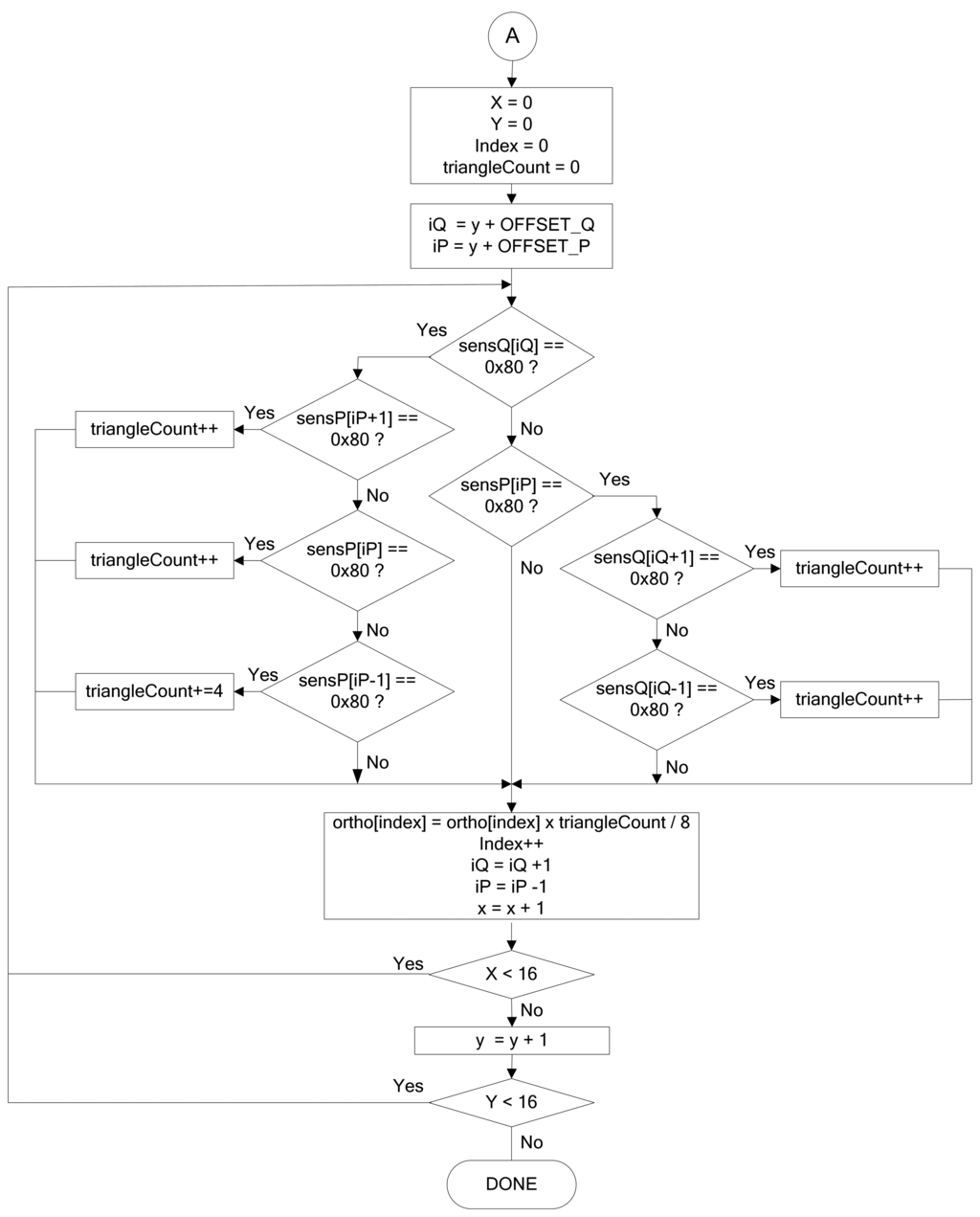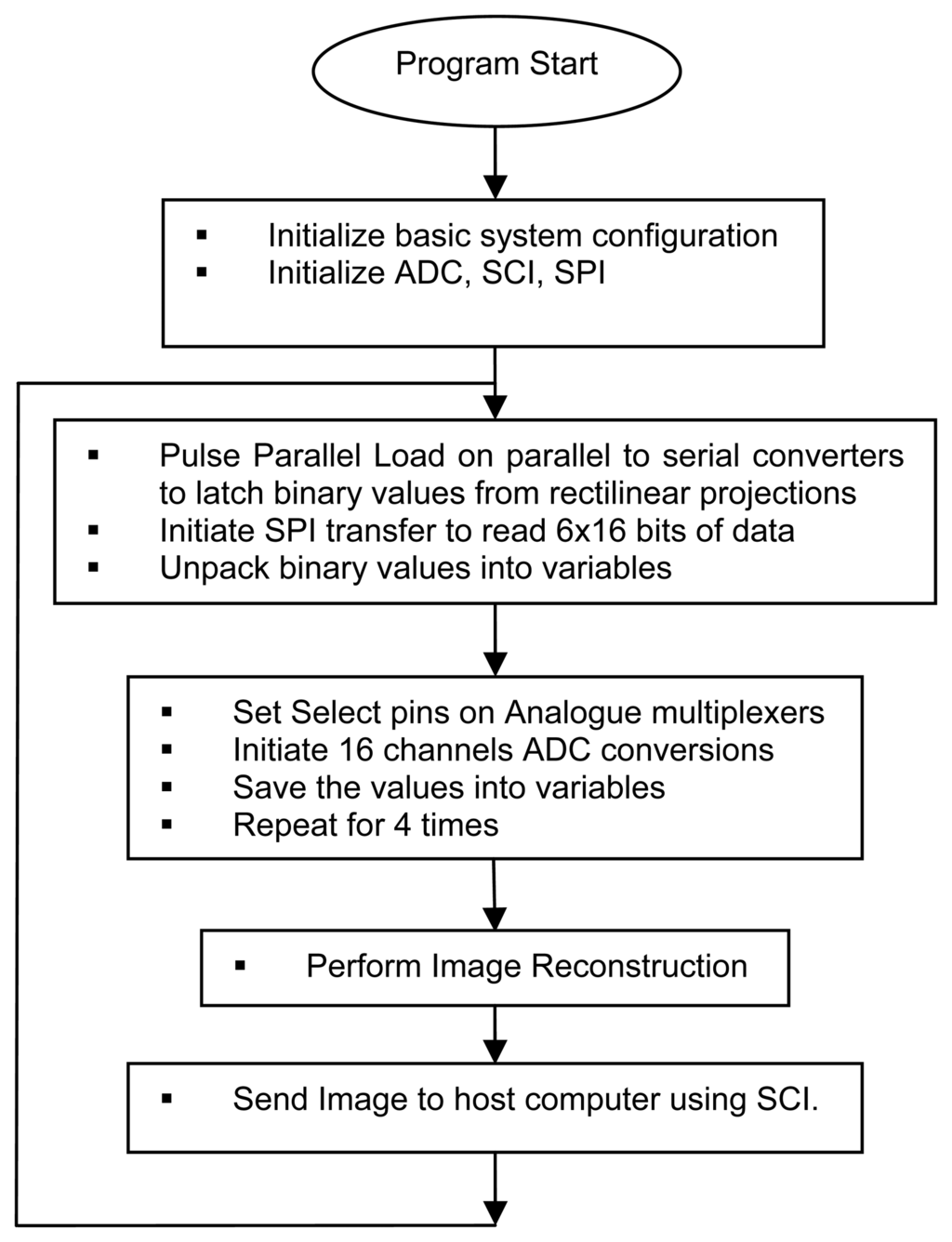 The overall operation performed by the DSP is described in Figure 9. Basically, the system was initialized at program start to set the configurations of ADC, SPI and SCI such as ADC channel sampling sequence, SCI and SPI bit length, parity and baud rate. After being initialized, data acquisition began by sending a pulse to Parallel Load pin on parallel to serial converters. This action latched the binary outputs from the comparator into the converter. Then, acquisition from rectilinear projection sensors was carried out by reading data from SPI. The use of SPI caused the binary values to be packed in six words, so they were unpacked into variables after the acquisition.