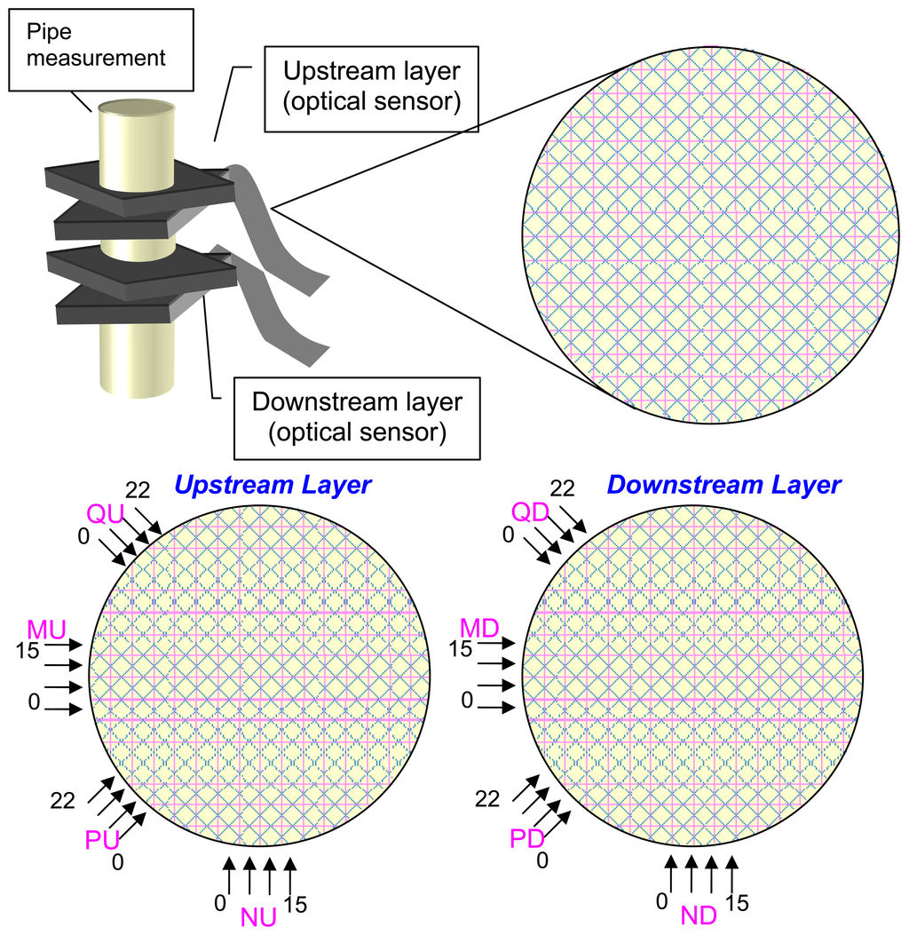 In this research, a fabricated optical sensor unit with sensors arranged in parallel beam projection has been implemented []. There are two layers of sensors being used, namely Upstream Layer and Downstream Layer to support the analysis of algorithm-based velocity profile measurement. At each layer, there are four arrays of sensors arranged in parallel beam projections. Two arrays of sensors, namely Orthogonal Sensors are arranged in such a way that their projected light beams are orthogonal (90°) to each other while another 2 arrays of sensors namely, Rectilinear Sensors are arranged so that their projected light beams are 45° to the orthogonal projections. This configuration is illustrated in Figure 2.