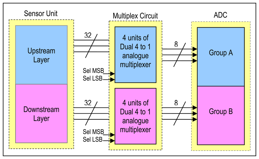 The ADC is multiplexed into two groups, namely Group A and Group B. Each group consists of eight channels, thus expanding the total channel inputs of the ADC to be 16 channels. Due to the fact that there are 64 signals to convert, the signals need to be multiplexed. Four dual 4 to 1 analogue multiplexers (4052) were used per layer to multiplex these signals. Using this configuration, all 64 channels measurements can be accomplished in four acquisitions. The dual 4 to 1 analogue multiplexer was also chosen instead of the 8 to 1 analogue multiplexer since there were 16 ADC channels that were available. The data acquisition process can also be controlled easily since only two input bits (Sel MSB and Sel LSB) need to be controlled by using GPIO port. The overall configuration is shown in Figure 4.