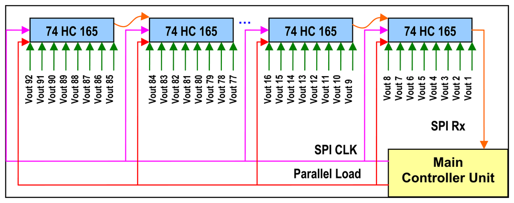 The resulting outputs (Vout) from the comparators were then connected to the data inputs of parallel to serial converter chips (74HC165) arranged in cascade. The embedded system only needed to load the parallel data bits by sending a pulse to the Parallel Load pin and generate clock signal to shift in the serial data. From the embedded system side of view, the Digital Signal Conditioning Circuit is merely a slave device with serial interface. This approach is less troublesome compared with using bus topology where buffers and more digital input and output lines are needed []. Besides that, the chip is able to support high speed data transfer. The overall topology of the digital signal conditioning circuit is shown in Figure 6.