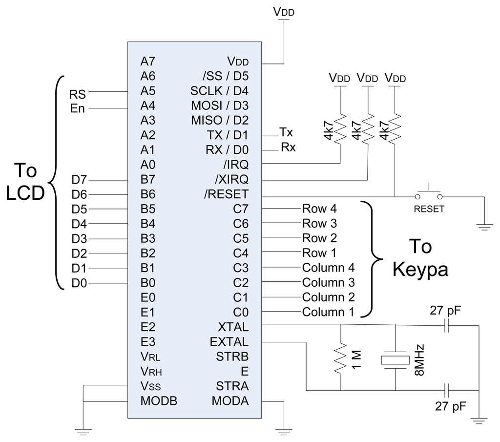 The Liquid Crystal Display is a standard 2 lines, 16 characters alphanumeric LCD module. The alphanumeric display is actually driven by a LCD driver built-in in the module. The LCD driver contains a table of standard alphanumeric characters stored in its volatile memory. Commands and data are sent to this driver by driving the necessary pins to certain patterns. Figure 8 shows the connections of the LCD module to the embedded system.