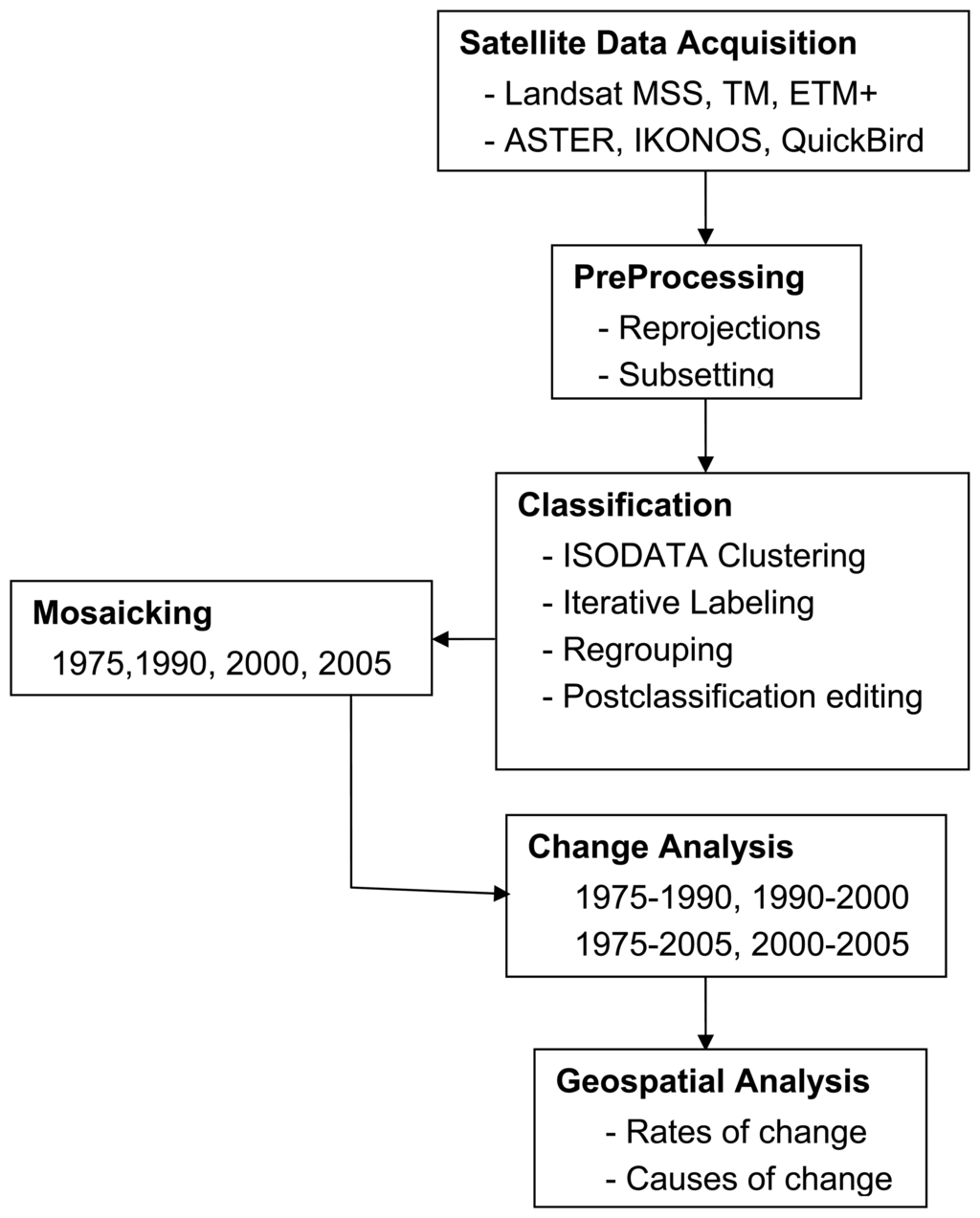 A schematic diagram of the methodology used for the study is presented in Figure 2. Prior to classification, images were checked and corrected for georeferencing errors inherent in the multidate images. Errors might have arisen because not all images were georectified with the same level of accuracy. Significant discrepancies were observed particularly in the case of MSS. To address this problem, we reprojected the problem images using image-to-image registration with RMS error of ± one-half pixel (15 m for TM). Images were resampled with cubic convolution, which has better spatial accuracy over the more commonly used nearest neighbor resampling [18-19].