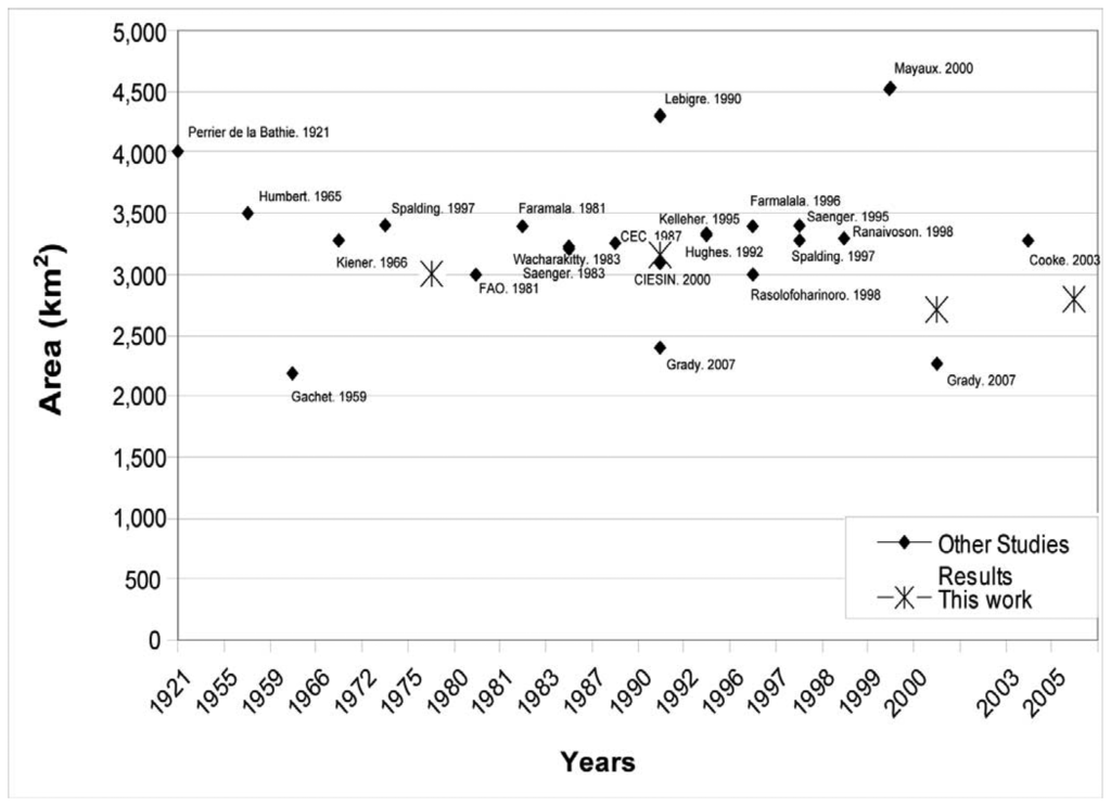 Mangrove forest areas obtained from various studies. Please note that the x-axis is not on a scale; the year followed by author is the publication date, and the date in the x-axis is the actual date of estimation.