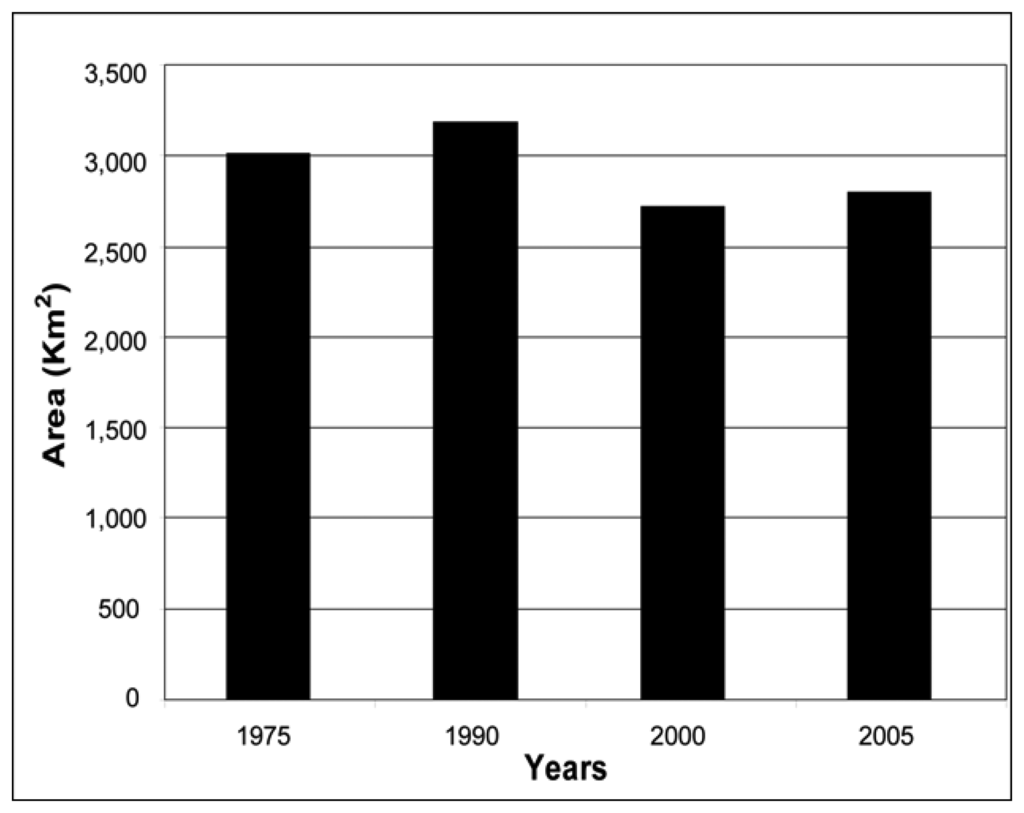 Following classification of images from each time period, a postclassification change analysis was performed for the change analysis. Change areas were reclassified to identify major causes. This approach is probably the most common and intuitive change detection method. Among the principal advantages of this approach is that it provides “from-to” change information. However, the approach may have three sources of uncertainty: (1) semantic differences in class definitions between maps, (2) positional errors, and (3) classification errors. To minimize the semantic differences in class definitions, we used the same number of classes for all four dates. To minimize positional errors, additional GCPs were selected and RMS was reduced to ± one-half pixel. Finally, postclassification editing using secondary data minimized classification errors. However, there might still be few minor errors associated with positional errors and classification errors.