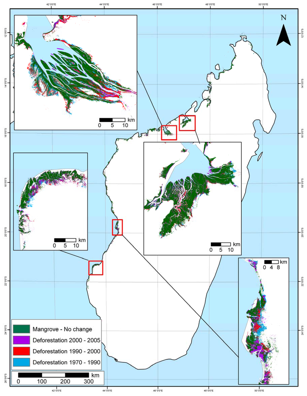 In spite of this importance and usefulness, accurate and reliable information on the distribution rates, causes, and consequences of mangrove forest change in Madagascar has not been available. Earlier studies [14-17] used remotely sensed data to map and, in some cases, to monitor mangrove forests at a local scale. However, national assessment and synthesis of the mangrove forest distribution and dynamics of Madagascar was not attempted. The objective of our study is to quantify the spatial and temporal dynamics and distribution of mangrove forests and to identify the proximate causes of change from 1975 to 2005 using remotely sensed data.