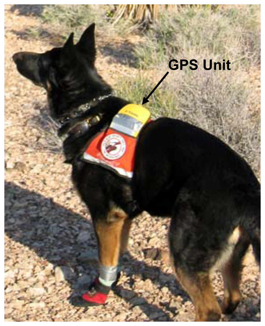 A GPS that collects real-time differentially corrected data, which downloads both the GPS signals and the correction factors and then applies the geometric corrections internally is ideal although post processing data will also provide accurate track data. At present such GPS units are costly and are relatively large and heavy. To prevent physical injury to the dog from wearing a GPS the unit should be counter-balanced. This also keeps the GPS antennae pointed upward to maximize continuity in satellite reception. Dogs need to be comfortable with and accustomed to working while wearing equipment for detection distance data to yield valid results. Desensitizing working dogs to such equipment is simple and does not require much time. These fine details are important to ensure that the dogs are working uninhibited by equipment or experiencing distress. Either of these factors may affect their responses and thus affect the detection distance data.