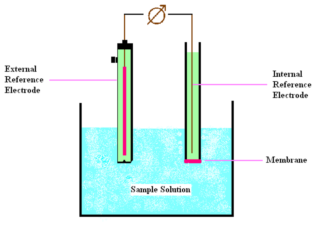 Potentiometric measurements are based on monitoring potential values under a zero current flow regime, in order to determine the analytical concentration desired components in an analyte. In these methods the potential difference between an indicator electrode (i.e. ion-selective electrode, redox electrode, metal-metal oxide electrode) and the reference electrode is measured as the analytical potential. The potential of an electrochemical cell is due to the changes in the free energy that occurs if the chemical phenomena reach an equilibrium; which is a concept that is typically applied in quantitative analysis in relation to electrochemical cells, in which case, the difference between the cathodic and the anodic potentials is the potential of the electrochemical cell and is calculated using the so-called Nernst equation. Another source of potential may be physical phenomena not involving explicit redox reactions but having non-zero free energy initial conditions. For instance ion concentration gradients across a semi-permeable membrane can is one of such phenomena. This can also be potentiometric phenomena, and is the basis of measurements that use ion-selective electrodes, according to which the below equation is used to determine the concentration of the analyte: