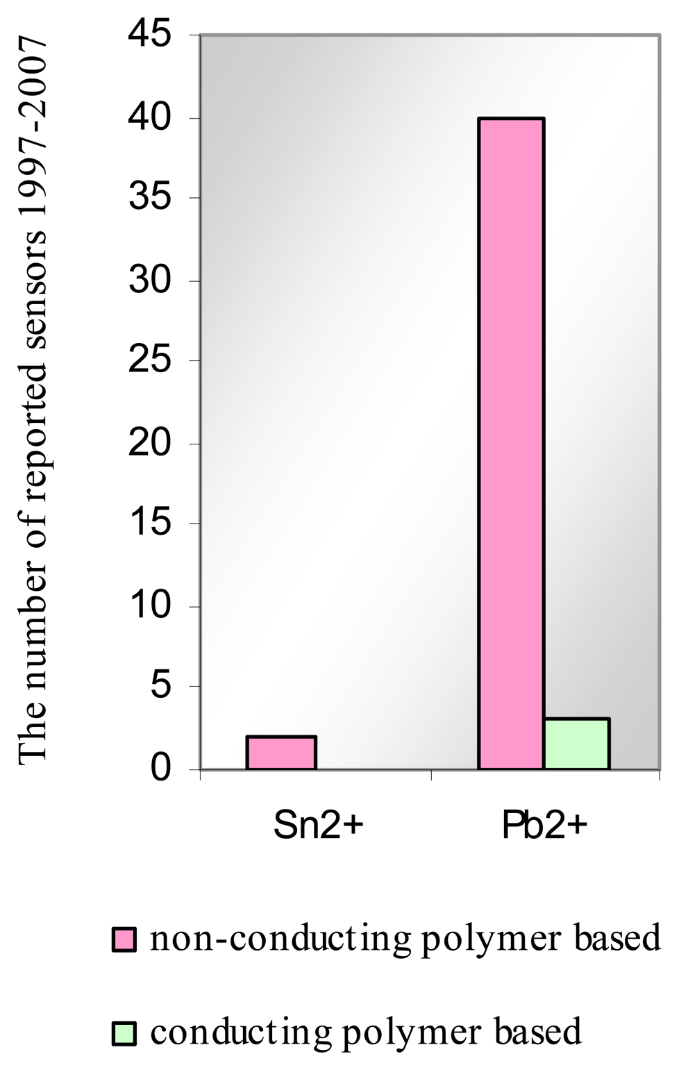A brief description of potentiometric sensors assimilating conducting polymers is presented. There are several reports of ion-selective sensors based on conducting polymers including about nine reports about H+ sensors including different conducting polymers often doped with different agents [36-44]. Hutchins and colleagues reported in 1993 a pH sensor with a linear dynamic range of 10-11 to 10-2 M concentration of H+. A Li+ assay was reported by Bobacka et al. in 1994 using a potentiometric sensor that included a conducting poly (3-octylthiophene) polymer, which was also investigated with Ca2+ and Cl-[60]. There is a single report of Na+ sensor by Cadogan et al. in 1992, where the detection limit for sodium ions was reported to be 3×10-5 M [45]. Eight K+ selective sensors were developed during 1999-2007, among which the best detection limit was 10-7.4 M, reported by Pawlowski et al. in 2006 [46-53]. In the same year Paczosa-Bator et al. obtained a slope of 29.1 for the calibration curve for a Mg sensitive conducting polymer doped with ATP [55]. Over a three year period (2003-2006) seven Ca2+ ion sensors based on different conducting polymers were reported [56-62]. MMA/DMA copolymer was incorporated as a conducting polymer in a Ca2+ sensitive sensor by Sutter et al. in 2004. The detection limit was determined to be 10-9.3 M. A sensor for strontium ions which included polymers of polyaniline with polycarbonate was fabricated in 2002 [64]. In 2006 and 2007 two Cu2+ electrochemical sensors based on a common conducting polymer were reported while the doping agents were not the same [65, 66]. Poly(3,4-ethylenedioxythiophene) films doped by hexacyanoferrate anions was one combination used as a conducting polymer for Cu(II) selective sensor. Five papers on Ag+ sensors based on conducting polymers were published [67-70]; three of them were in 1995, in which Vazques and coworkers made a sensor detecting 10-5.3 M of Ag+. Khan et al. in 2004 developed a novel ion selective membrane electrode for assay of Hg(II) reaching a detection limit of 5×10-5 M. A polypyrrole/polyantimonic acid combination was used as conducting polymer [73]. Pandey et al. in 2002 developed a polypyrrole based sensor for Zinc capable of determining Zn ions in the linear range of 10-1 to 10-5.6[72]. Lead ions were determined in one case in 2007, in which Kissiel et al. reported a linear dynamic range of 10-2 to 10-5 M for a calibration curve with a slope of 29.9 for Pb ions [63].