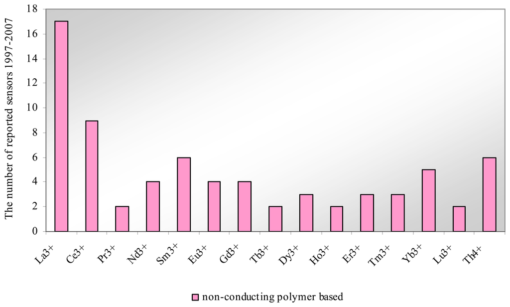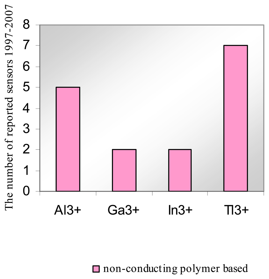 During the past decade, there were five reports on Al3+ ion selective electrodes based on furyl (ethanedione, di-(2-furyl)), bis(5-phenylazosalicylaldehyde)-2,3-naphthalene diimine, hydroxythio-xanthones, xanthone derivative, and N,N-bis(salicylidene)-1,2-phenylenediamine (salophen) [185-189], two reports on Ga3+ sensors based on clorogallium(III), 2,9-dimethyl-4,11-diphenyl-1,5,8,12-tetraaza-cyclotetradeca-1,4,8,11-tetraene (DDTCT) [190, 191], two reports on In3+ ISEs based on 1-benzyl-3-methyl-4-benzoyl-5-pyrazolone, 15-crown-5-dicyclohexano-18-crown-6 [192, 193], and seven reports on Tl3+ ion selective electrodes based on quinoline-carbonitrile calix[6]arene or calix[5]arene derivatives, 1,21,23,25-tetramethyl-2,20:3,19-dimetheno-[H,2]H,23H,25H-bis-[1,3]dioxocino[5,4-i:5′, 4′-i]benzo[1,2d:5.4-d']bis[1,3]benzodioxocin, 2′-amino-1,3,5′-trioxospiro[indane-2,4′(5′H)-3′-cyano indeno(1.2-b)]pyran, dibenzyldiaza-18-crown-6, tetrachlorothallate(III)-2,3,5-triphenyl-2-H- tetrazolium ion pair, and N′-dioctylethylenediamine-N′-disuccinic acid [194-200]. The statistical diagram of the reported potentiometric membrane sensors based on non-conducting polymer for third main group cations is shown in Figure 9. According to the literature survey, there are no reports on potentiometric sensors based on conducting polymers for third main group.