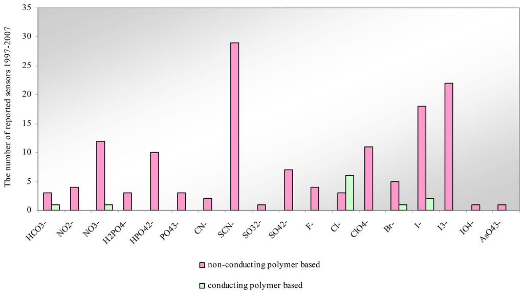 Some anions also have been under investigation by conducting polymer based electrochemical sensors during the last decade. The first halogen (F-) was determined together with H2PO4 with a modified polyaniline sensor by Shiskanove et al. in 2005 [77]. Six publications have probed chloride ion sensors during 1999 to 2004 [78-83]. The best detection limit was achieved by Michalska et al. in 2003. They obtained a detection limit of 4×10-7 M utilizing a polypyrrole as conducting polymer. Another halogen (Br-) was investigated once in 1997 by Wang et al. achieving a detection limit of 6×10-5M for Br-[84]. In 1994 Galal et al. reported an iodide selective sensor and there was another report on an iodide sensor in 1999 by Wolf et al. in which I- was determined down to 5×10-4 M [85,86]. A potentiometric sulfide selective electrode based on two different conducting polymers with a fine performance was developed by Atta et al. The detection limit of their proposed electrode was 8×10-7 M of sulfide ions [76]. Hutchins et al. also investigated a NO3- selective electrode in 1995 [75]. The linear dynamic range of the latter report was 8.0×10-5 to 2.5×10-2 M of NO3-. In 2002 Song et al. reported a CO32- sensor incorporating poly(1-hexyl-3,4-dimethyl-2,5-pyrrolylene) as conducting polymer [74]. Another organic compound, dodecylsuphate (DDS), was determined by a conducting polymer based sensor in which the detection limit was investigated to be down to 5×10-6 M of DDS [86].