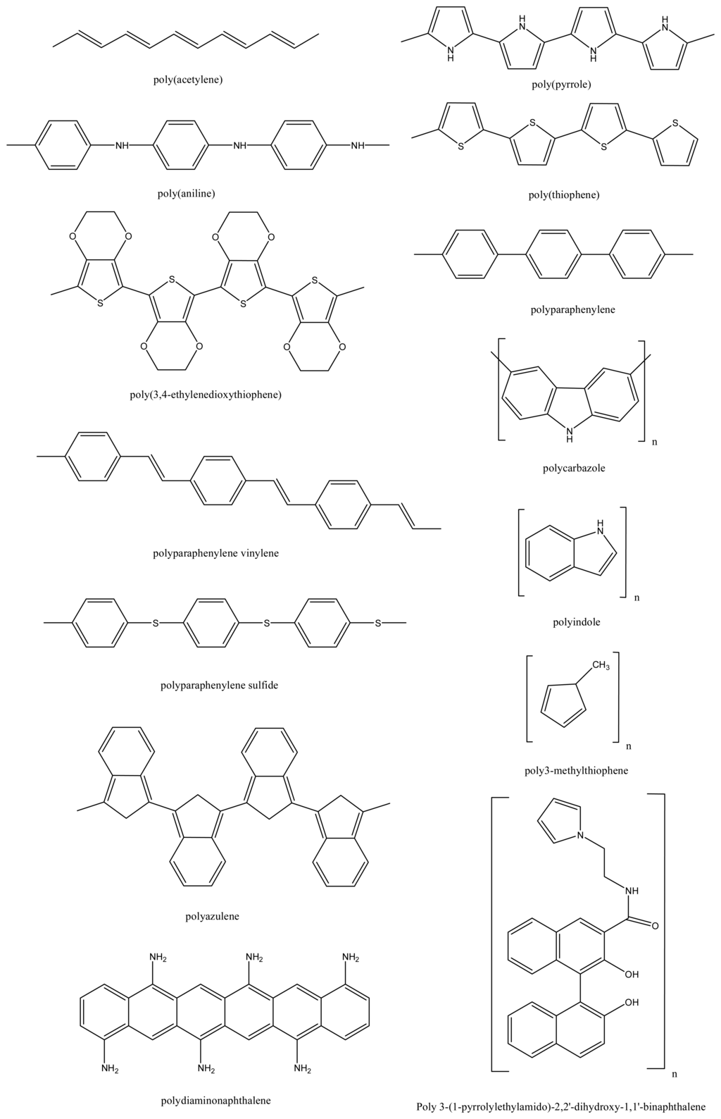 Because of the priceless electrical and electrochemical characteristics of conducting polymers, they have found many applications since their discovery. One of them is their wide use in the fabrication of electrochemical sensors such as potentiometric, amperometric and conductometric sensors [10, 18]. They can be used to convert chemical information such as concentration or activity into electrical signals in the solid state. Combination of the properties of the conjugated polymer transducers with those leading to selective molecular recognition is a very important step in the way of obtaining durable chemical sensors. This wide application and great interest is mostly due to the their potential to exhibit improved response properties and also their high sensitivity to small perturbations which are great advantages in comparison to the inert polymers were which used only to enhance the mechanical strength of the membranes. Apart from their unique conductivity and ion transport properties leading to the mentioned advantages, conducting polymers also enjoy the benefits of being compatible with biological molecules in neutral aqueous solutions or even they can be used to bind biomolecules to a biosensor [18-22].