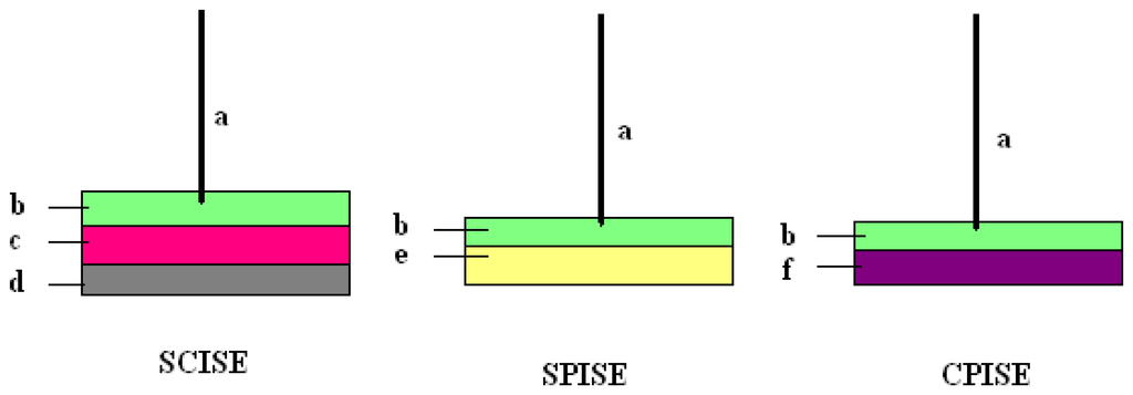 different types of conducting polymeric based ISE; a) electronic conductor; b)electronic conductor with a high work function (the work function is the minimum energy needed to remove an electron from a solid to a point close to the solid on the macroscopic scale outside the solid surface); c) conducting polymer; d) ion selective membrane; e) ion selective membrane containing conducting polymer; f) conducting polymer doped with ionophores.