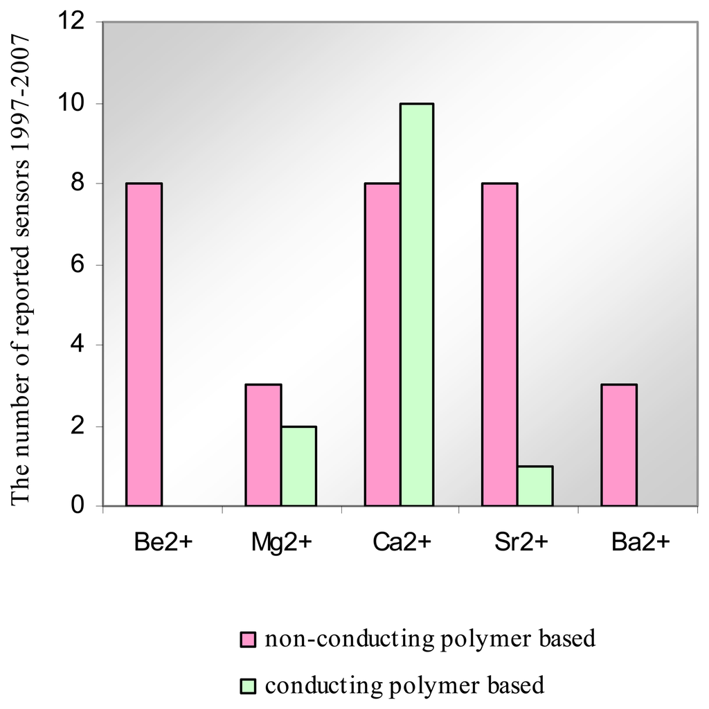 During the past decade, there were nine reports on Be2+ ion selective electrodes, mostly based on benzo-9-crown-3 and its derivatives [102, 158-165], three reports on Mg2+ based on the synthetic neutral carrier ETHT 5504, araldite zirconium(IV) selenomolybdate and benzo-15-crown-5 [166-168], more than eight reports on Ca2+ based on polyaniline functionalized with bis[4-(1,1,3,3-tetra-methylbutyl)phenyl]phosphate, bilirubin (1,3,6,7-tetramethyl-4,5-dicarboxyethy-2,8-divinyl-[b13]-dihydrobilenone, dibenzo-18-crown-6, [2-(2-hydroxyphenyl)imino]-1,2-diphenylethanone, ETH 1001 and ETH 129, dimethyl 1-(4-nitrobenzoyl)-8-oxo-2,8-dihydro-1H-pyrazolo[5,1-a]isoindole-2,3-dicarboxylate, x-furyl dioxime [99, 169-175], For Sr2+ there were eight reports based on lipophilic diamides containing pyridine rings, dibenzo-24-crown-8 and 4-tert-butylcalix[8]arene, 5,11,17,23, 29,35-hexakis-(1,1,3,3-tetramethylbutyl)-37,38,39,40,41,42-hexakis(carboxymethoxy)-calix[6]arene, 5,7,12,14-di-benzo-2,3,9,10-tetraoxa-1,4,8,11-tetraazacyclotetradecane, 1,10-diaza-5,6-benzo-4,7- dioxacyclohexa-decane-2,9-dione [174-181] and three reports on Ba2+ ion selective electrodes [182-184]. The statistical diagram of the reported potentiometric membrane sensors based on conducting and non-conducting polymer for alkaline cations is shown in Figure 7.