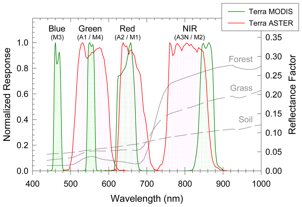 Compared in Figure 1 are the normalized spectral response curves of the three ASTER visible/near-infrared (VNIR) and first four MODIS bands that are commonly used in the computation of spectral vegetation indices (VIs). In general, these MODIS bands are much narrower in their bandwidths than the ASTER VNIR bands. Likewise, the red and near-infrared (NIR) bands of the two sensors are not centered around the same wavelengths. Whereas the MODIS red band completely avoids the red edge region (∼680 nm), the ASTER counterpart extends to cover that wavelength range. The MODIS NIR band overlaps at the longest wavelength portion of the ASTER counterpart. These are the consequences of the MODIS band selection requirements to avoid Fraunhofer lines and atmospheric absorption lines and to include key features in target spectra [26] and of the ASTER VNIR bandpasses inherited from those of the Landsat Thematic Mapper and/or the Optical Sensor of the Japanese Earth Resource Satellite (JERS-1) while assuring a provision of good signal-to-noise ratio, high spatial resolution data [13]. It should be noted that the ASTER sensor does not have a blue band.