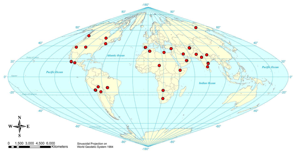 A sample of ASTER and MODIS standard daily atmospherically-corrected surface reflectance products (AST07 and MOD09, respectively) was acquired over the global land area (Figure 2). We first randomly selected 100 locations and then assessed the availability of near-cloud free ASTER scenes in year 2003 at each of these locations. When a near-cloud free ASTER scene was found, the MODIS scene on the same date at the same location was obtained. This first selection resulted in 82 paired scenes at 59 locations. A second screening on the selected scene pairs was performed because some of the scenes that were initially considered free of cloud cover were found to be contaminated with clouds. This second selection resulted in a total of 47 paired scenes at 31 locations (Figure 2).